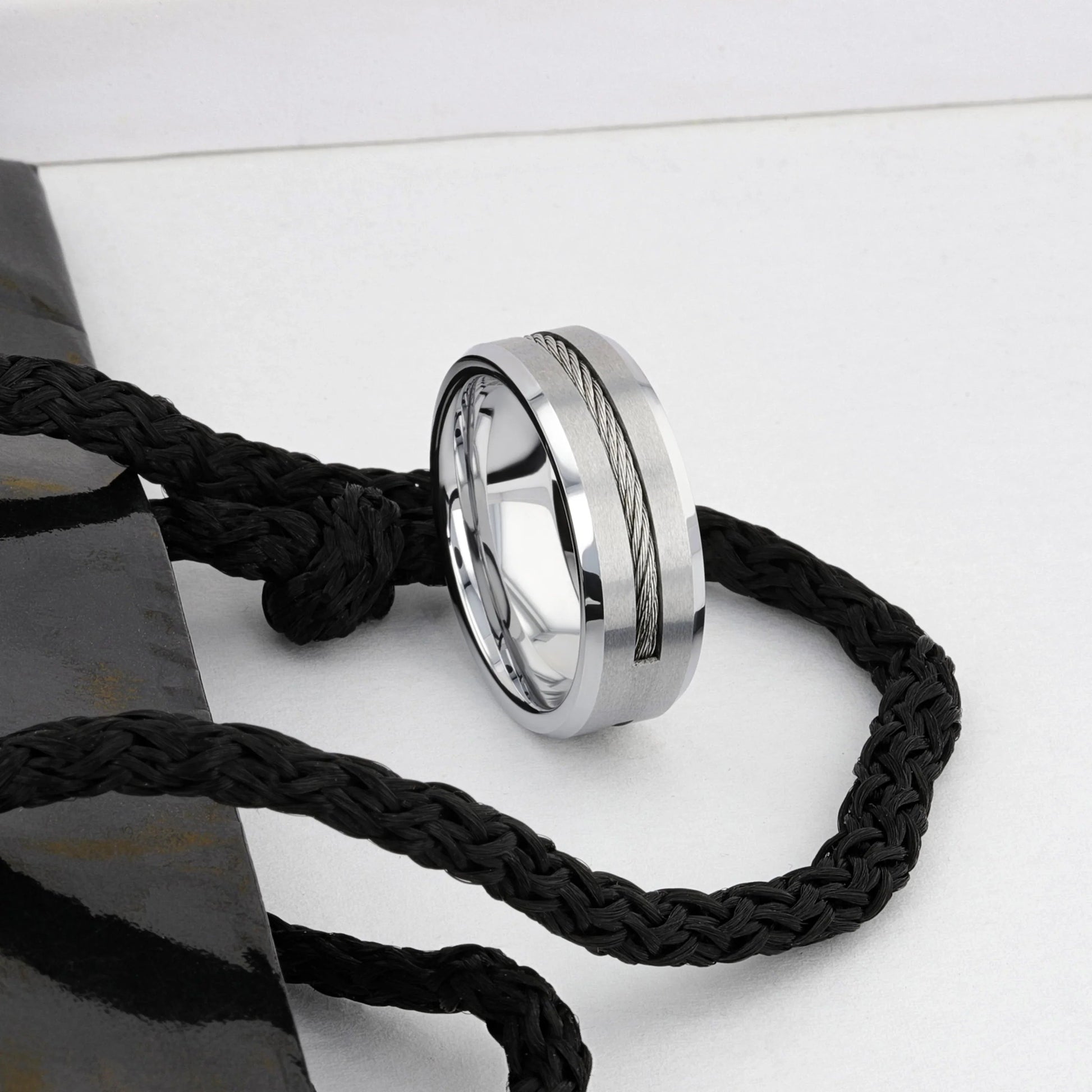 LANNISTER Men’s Tungsten Flat Wedding Band with Steel Wire Cable Inlay & Beveled Edges - 8mm