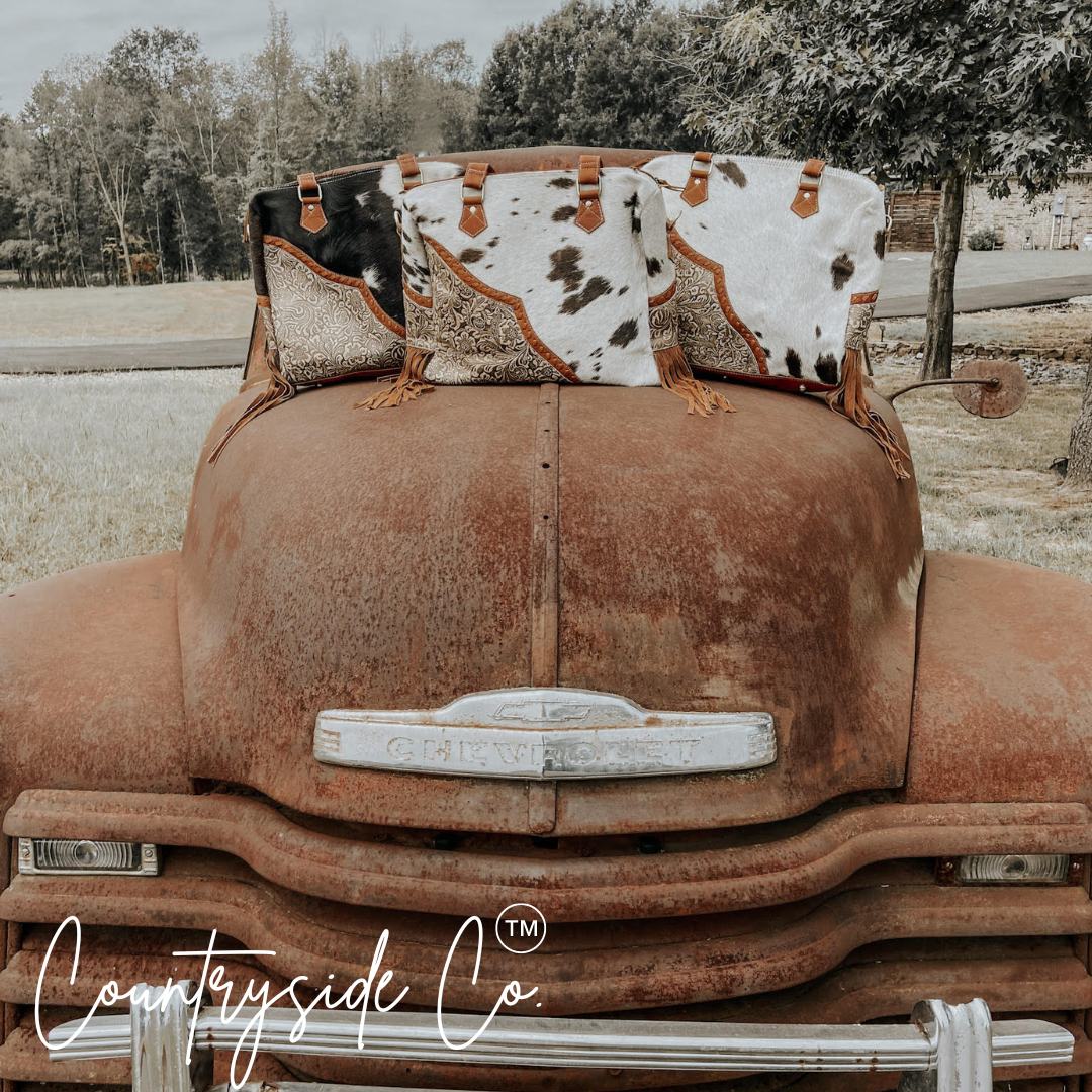 The Laramie Cowhide Leather Concealed Carry Handbag is made to stand out. The front features embossed leather with leather details and cowhide. The back is leather with two conceal carry pockets. There is also a leather detachable shoulder strap that is adjustable and has an silver accent. Every bag is made with unique cowhides so no two are alike.