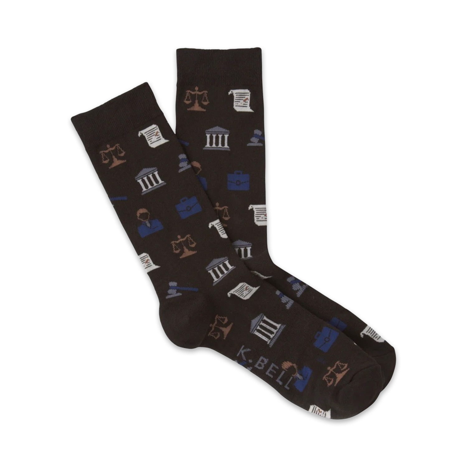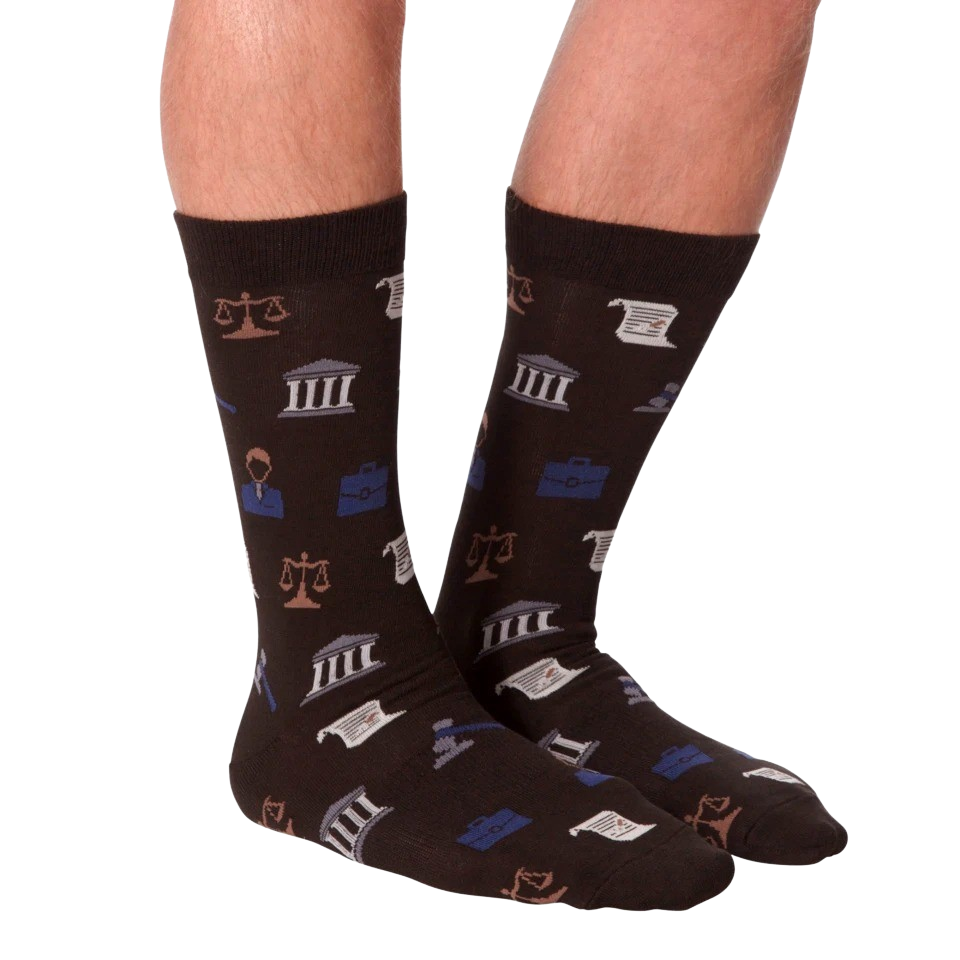 Show off your knowledge for criminal law and fancy courtroom suits. These cool socks will have you looking so good, you might get sued! This pair of all black crew socks features an all over pattern of common legal icons in different colors. This court is adjourned!