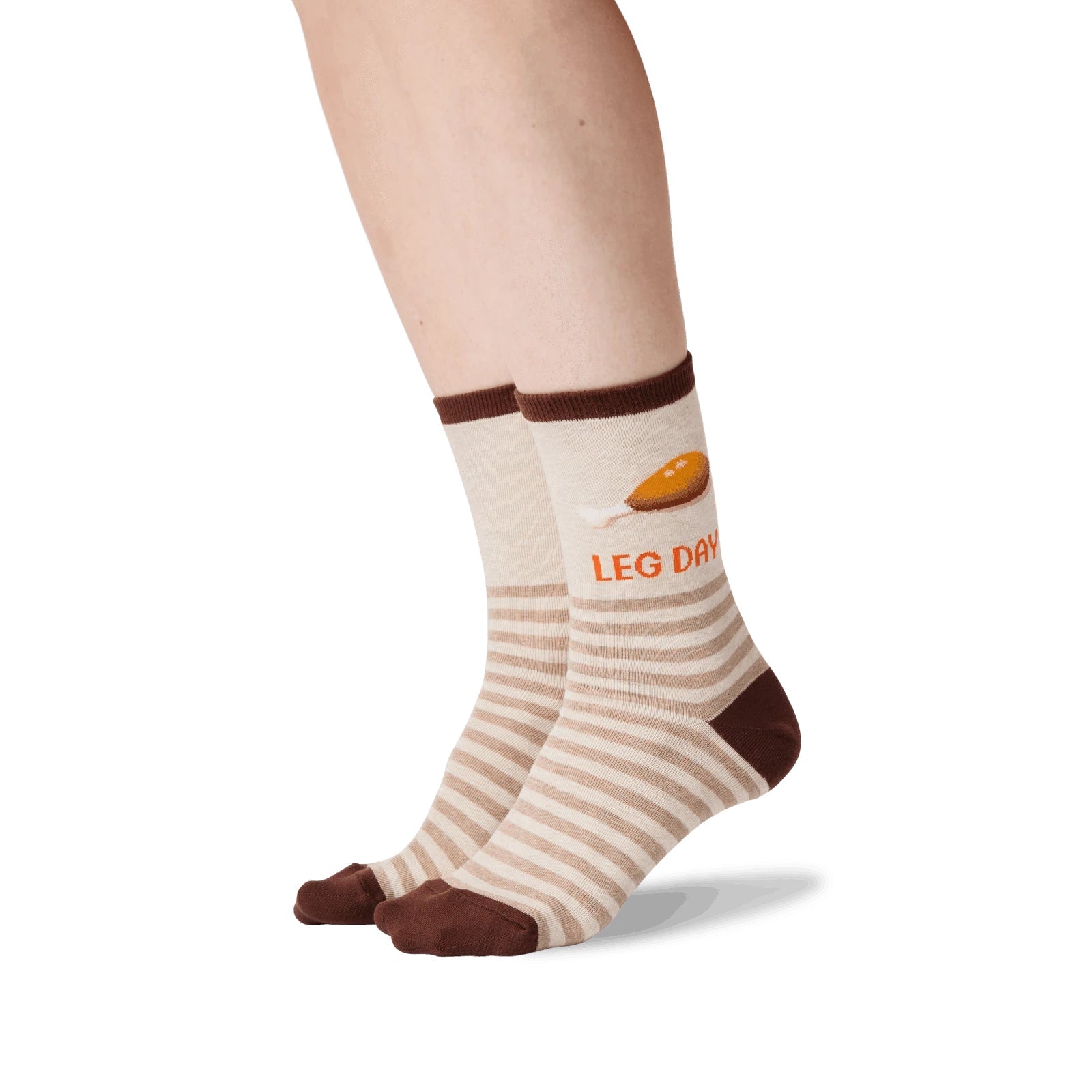 These 'Leg Day' socks are a fun way to celebrate (or commiserate) your workout. They're cream-colored with brown stripes and feature a cute illustration of a roasted chicken leg- and the words 'LEG DAY' in orange. The visible portion shows a classic crew sock style. Perfect for adding a touch of humor to your gym bag or everyday wear. They're comfy enough for all-day wear, and the design is simple but makes a statement.