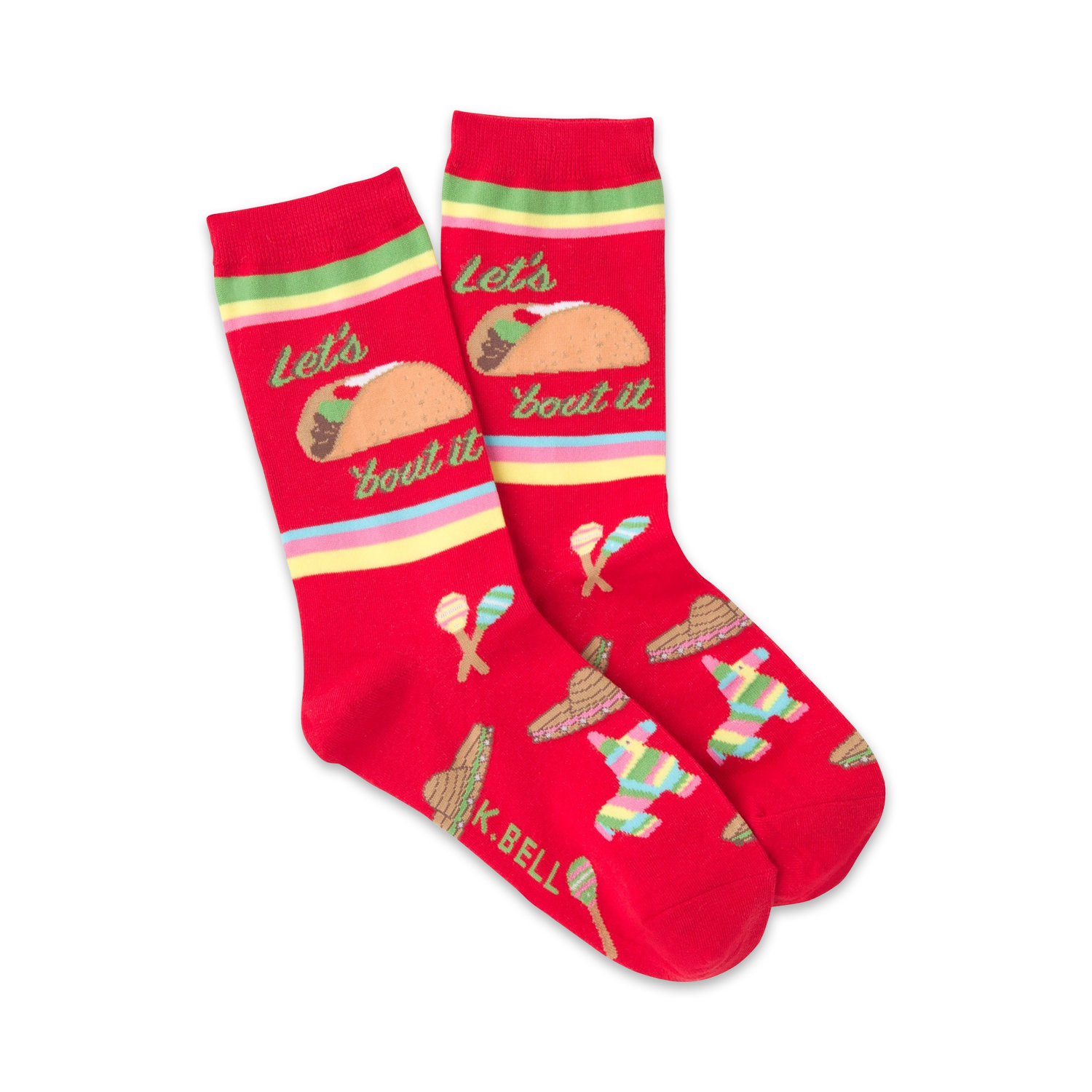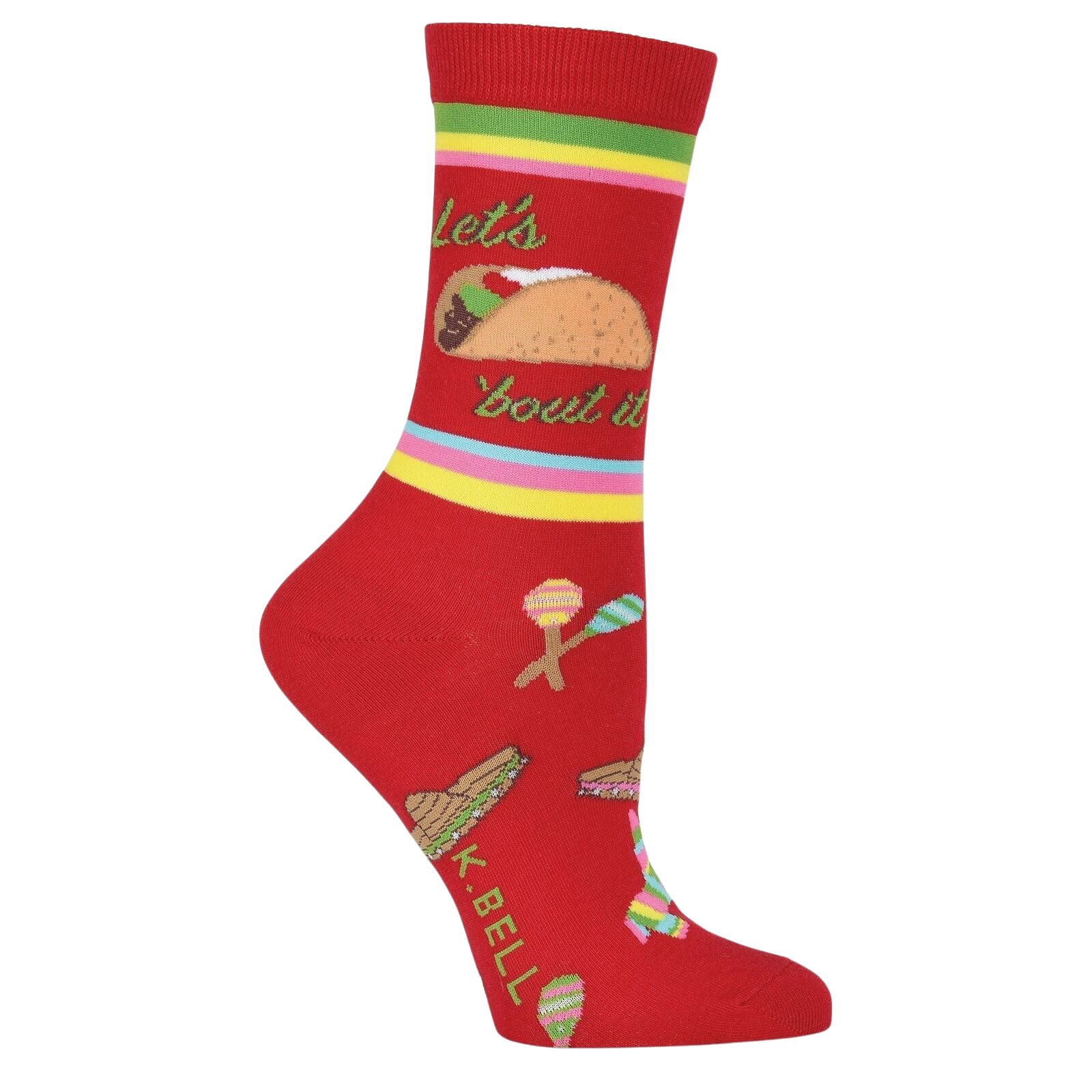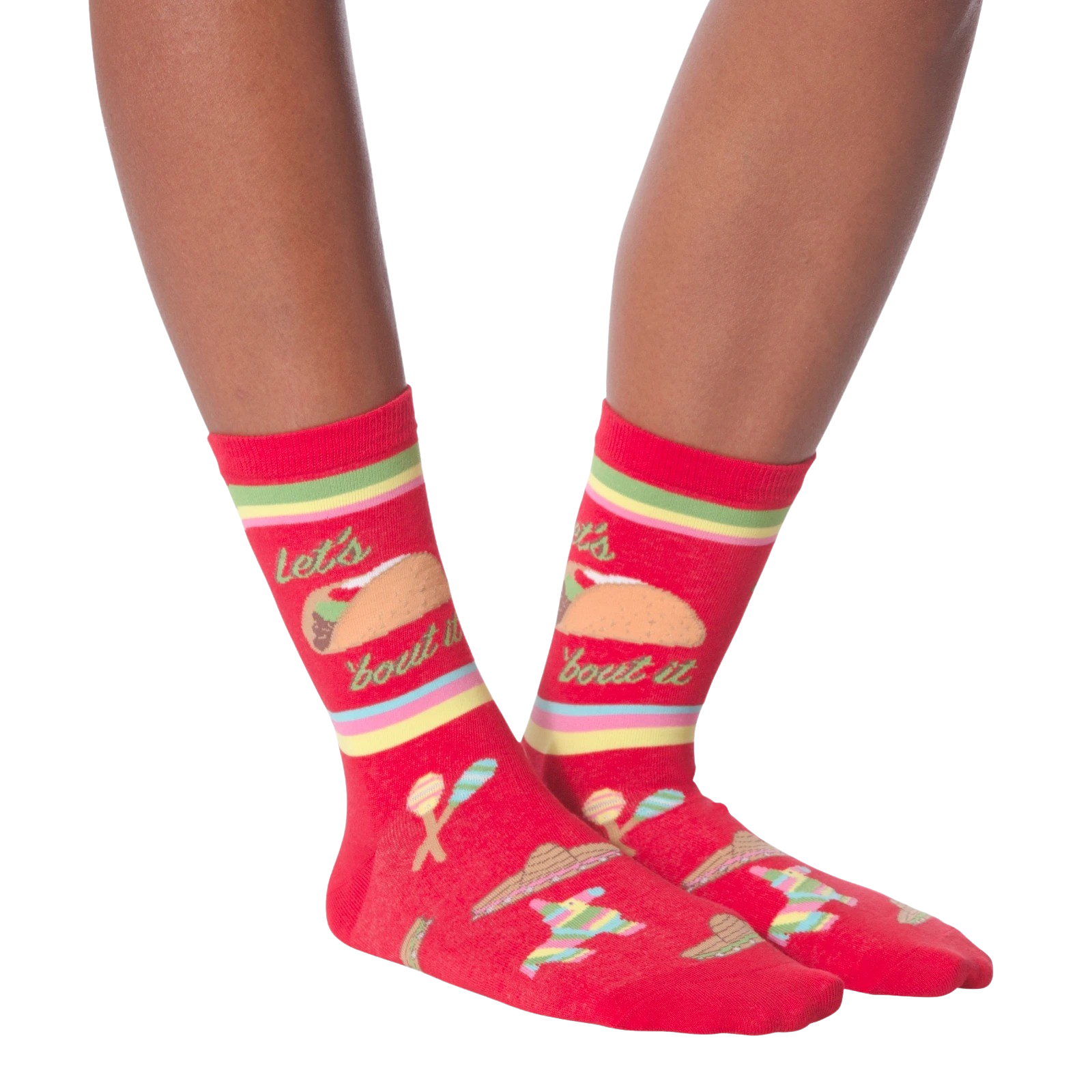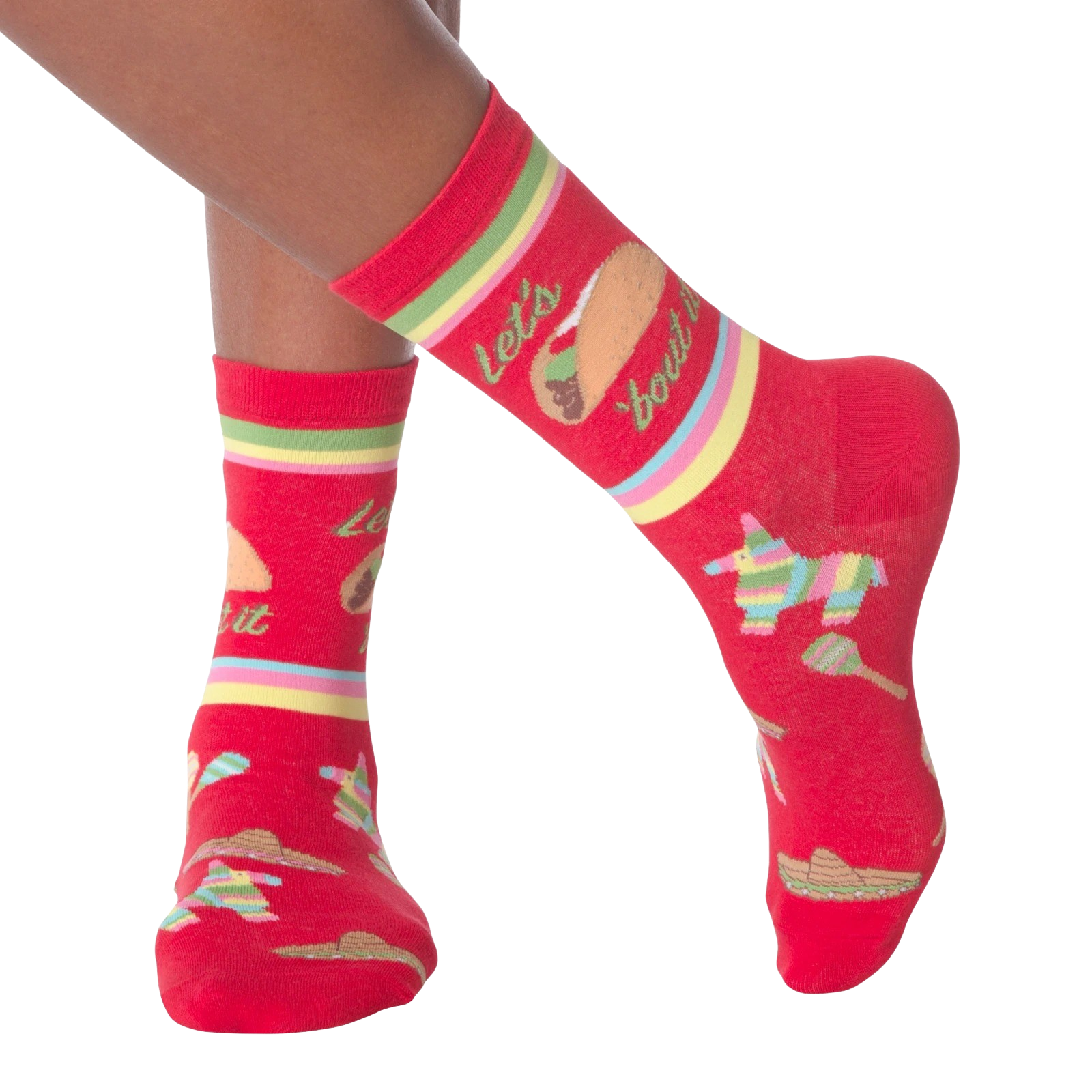Feelings sometimes run as deep as the melted cheese on a taco shell. No one said life would be easy. Pull up a chair, let's taco' bout it. These funny socks features the fun phrase surrounded by colorful stripes, maracas, and sombreros. Add these cool feet warmers to your collection of taco lovin' outfits.