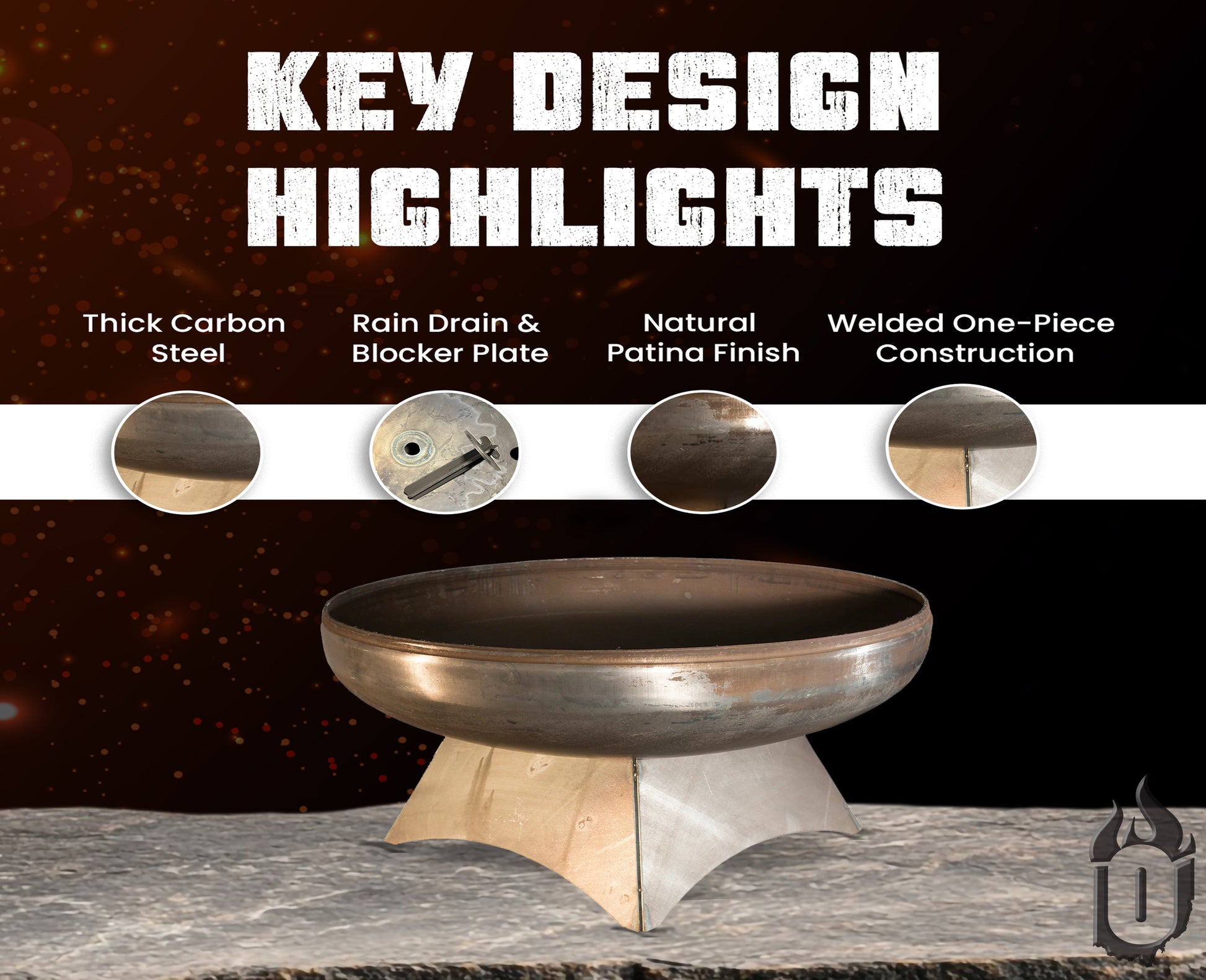 “The Liberty” American Fire Pit by Ohio Flame combines bold and linear styling with tough American quality and durability. With no parts to break or wear out over time, this Fire Pit is built to last a lifetime. “The Liberty” is crafted from thick carbon American steel that is sourced from local steel mills. No maintenance is required for this Fire Pit, as it’s designed to withstand the elements year-round. “The Liberty” features a substantial Rain Drain to allow for water drainage, and now comes with a our 4" Round Blocking Plate with Standard Length Centering Tee (to close off the Rain Drain if you don't want ash falling through the Rain Drain). The “Natural Steel Finish” will develop a natural iron oxide patina and gradually darken over time. This Fire Pit is 100% American Made and is crafted by a local artisan. “The Liberty” is backed by Ohio Flame’s Lifetime Warranty, guaranteeing that the Fire Pit will last a lifetime.