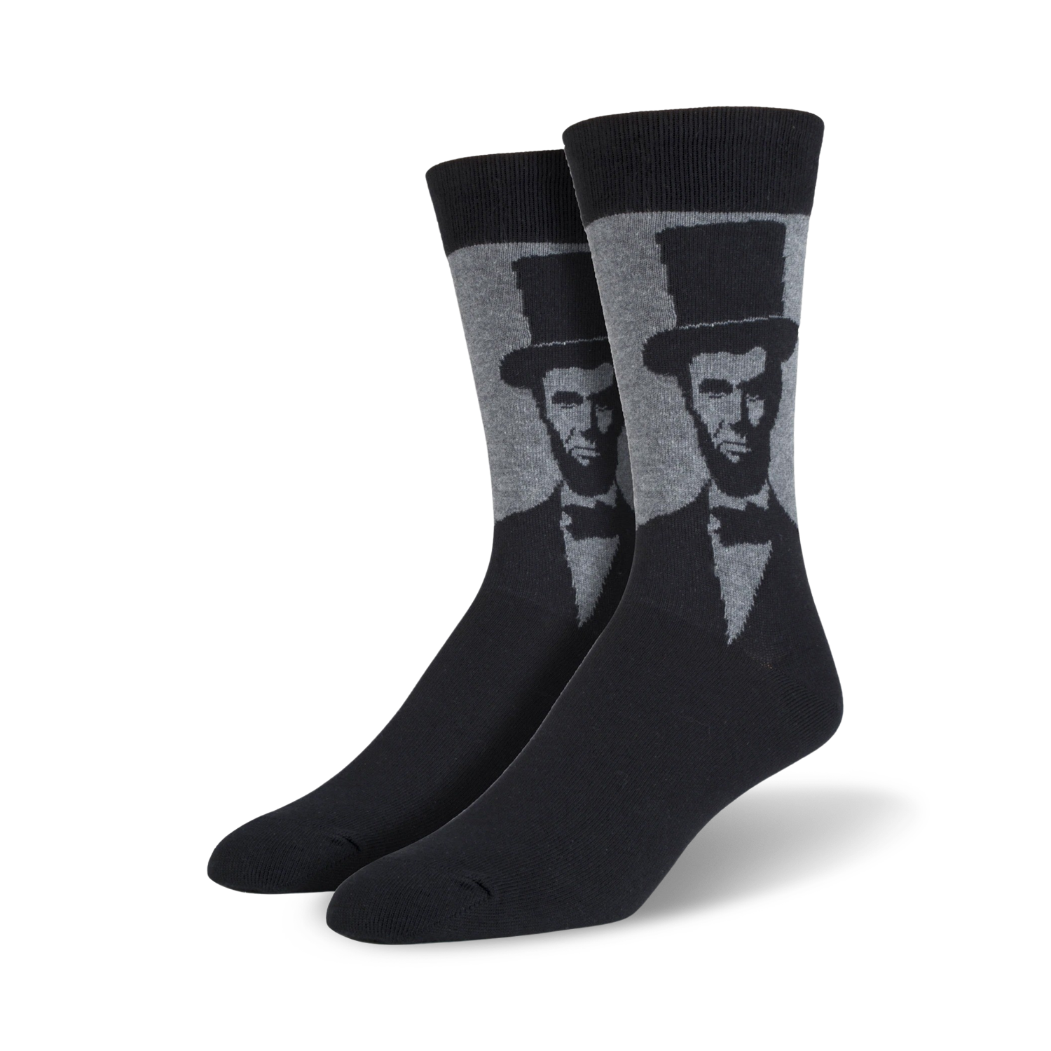 Show off your love for history by wearing some fun novelty socks depicting the 16th president of the United States! Each presidential pair of all black crew socks features a monochrome image of Abraham Lincoln. He is wearing his iconic top hat and suit. Nothing wrong with being a history buff.