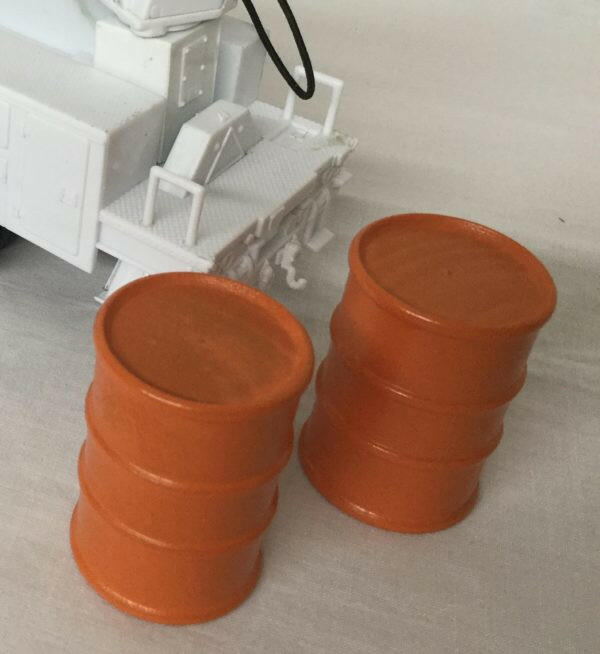 BARRELS: TWO miniature orange construction barrels constructed with wood. 1 7/8 inch tall.