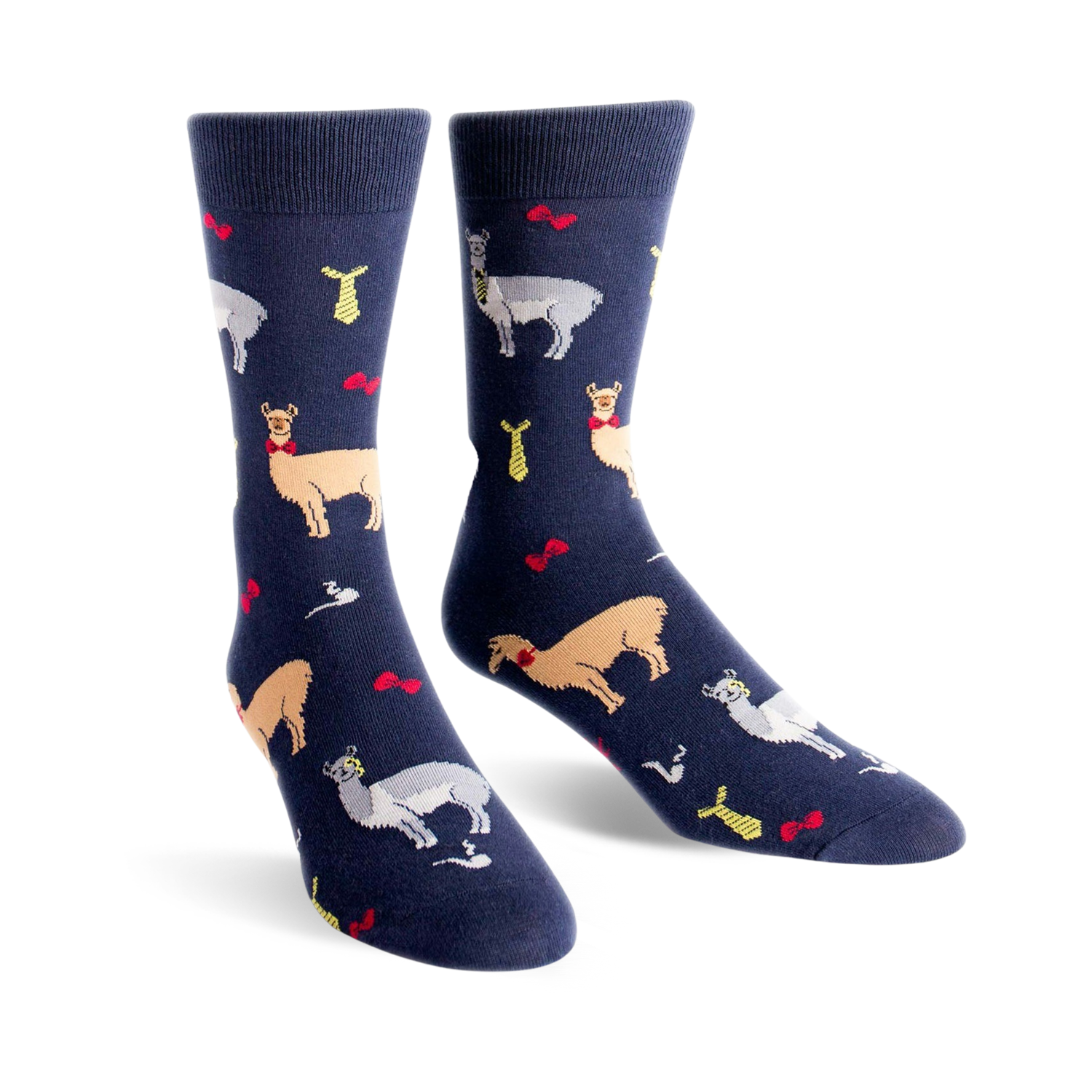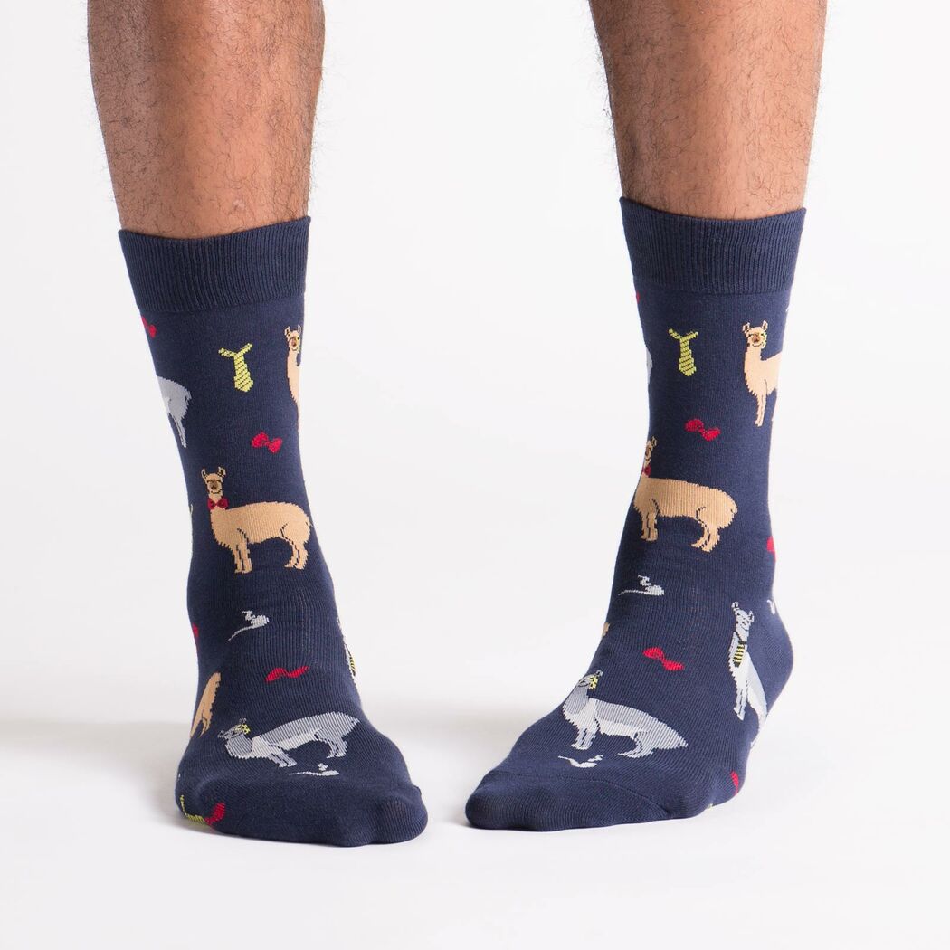 Llama Drama Crew Socks: Bring the drama to your feet with these navy blue socks featuring llamas wearing dapper bow ties. These socks are sure to turn heads and spark conversations wherever you go. Fun Fact: Llamas can't spit like camels, but they do make a strange humming sound when they're feeling annoyed. So, next time you're feeling a little dramatic, slip on a pair of Llama Drama socks and embrace your inner llama!