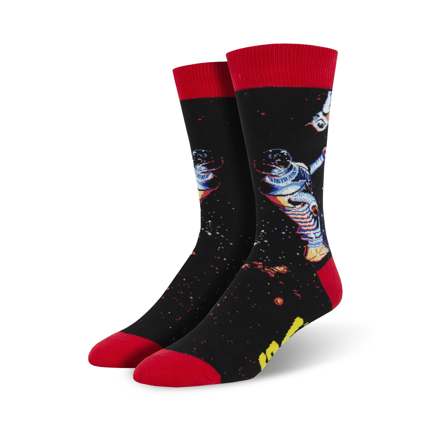 Get ready for a blast off with our Lost in Space socks, perfect for the cosmic adventurers and astronomy enthusiasts! The exquisite black canvas adorned with vibrant red cuffs and toes is a stellar sight. Dive into the boundless cosmos with our intrepid astronaut, soaring through a celestial tapestry of stars and planets. Wear these cosmic wonders and soar to new heights, leaving earthly boundaries behind.