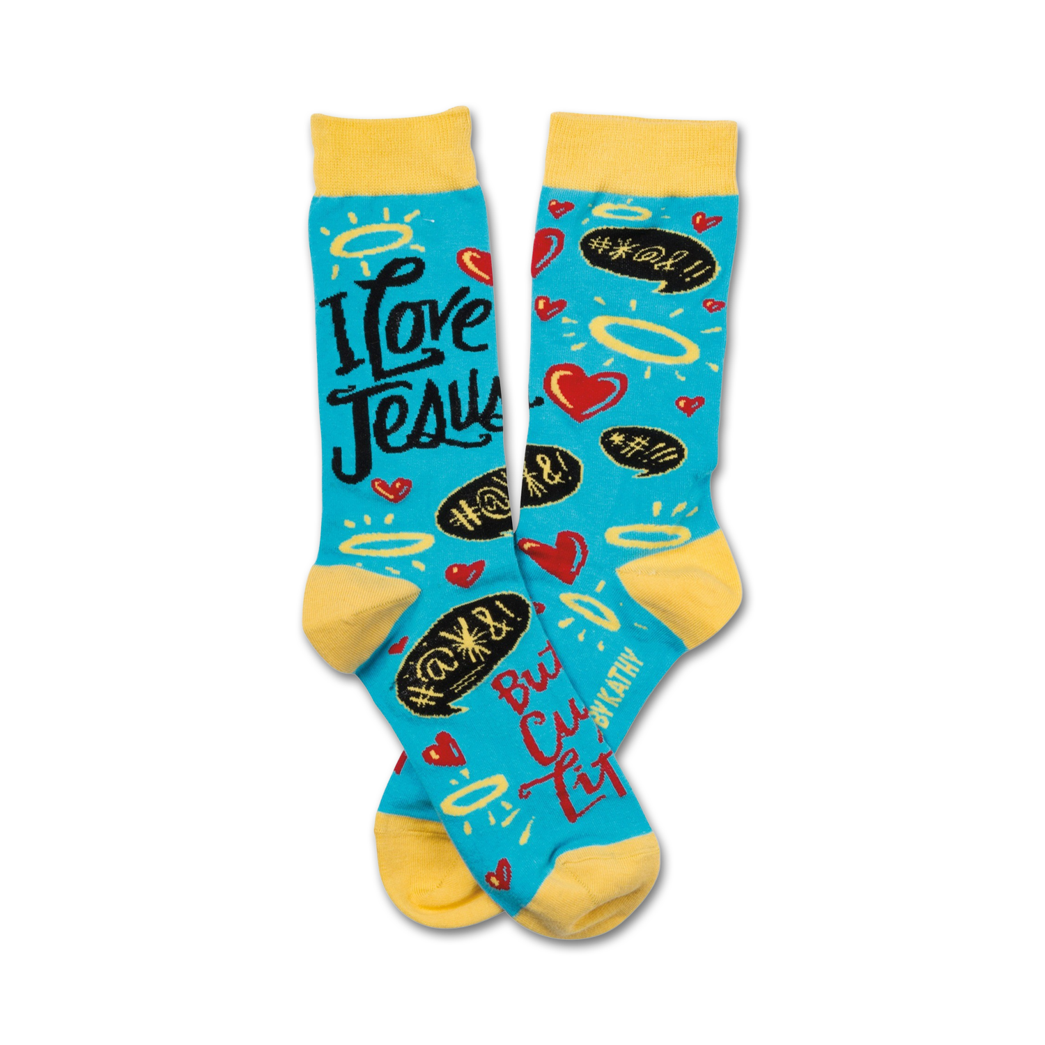 Bringin' you the 'Love Jesus - I love Jesus but I Drink a Little' sock collection, where angels get tipsy and halos like to party. These crew socks for women are the perfect blend of piety and whimsy. The blue and yellow design is cheerful, with hearts and halos surrounding the text 'I Love Jesus'. But hold on, the twist comes with the cheeky 'But Cu Lit' (meaning 'But Cute Little') hidden below. It's like saying, "I'm a believer, but I also know how to have a good time."