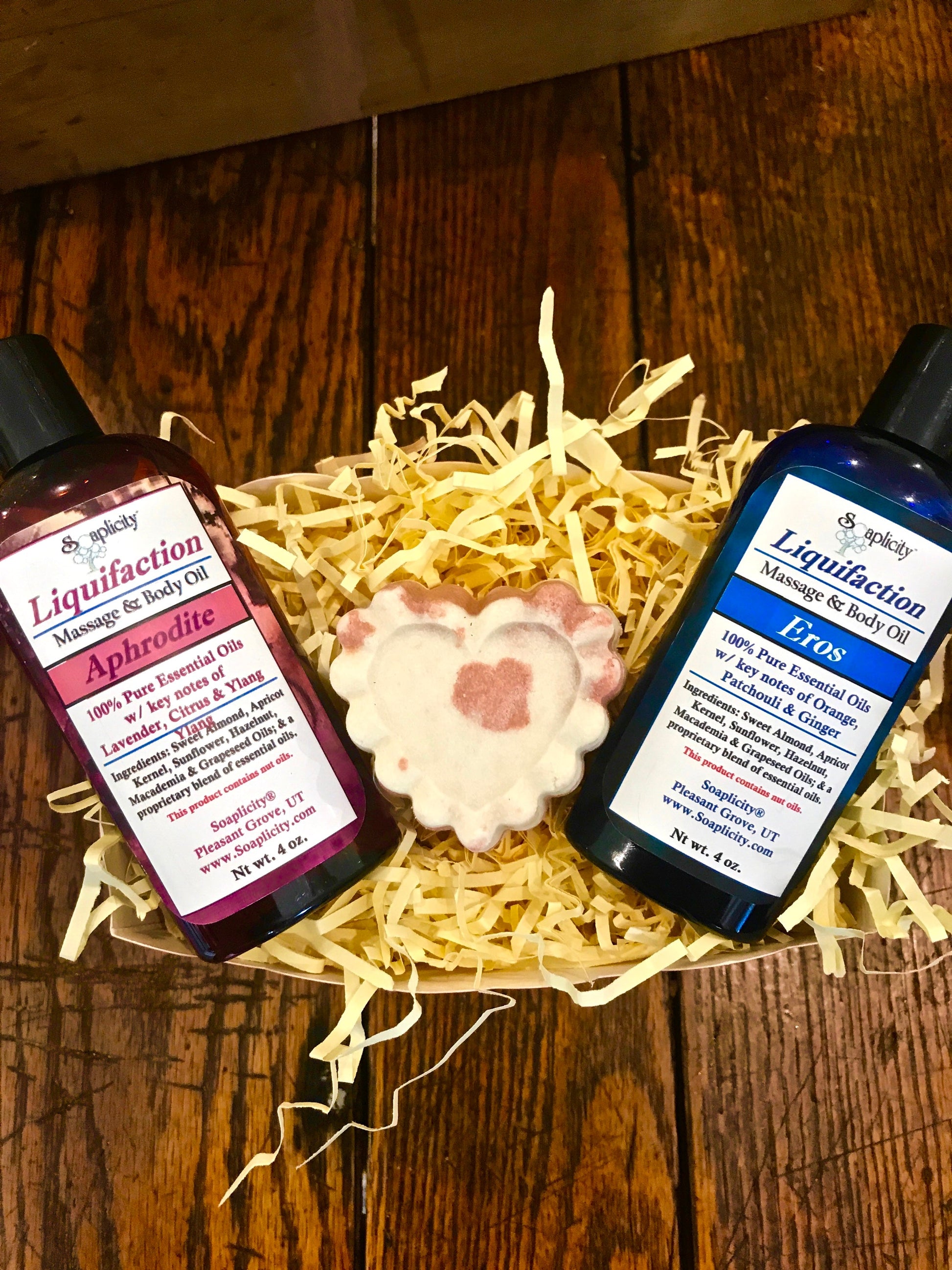 Perfect for a romantic getaway for couples, our Lover's Massage Gift Set offers one each of our all-natural So Sexy (A Hot Pink Mess) Bubble Bomb and our best-selling couple's massage oils of Eros and Aphrodite, all wrapped up in fun packaging. Enjoy a wonderful evening in or easily take it with you without worrying about a mess in your luggage!