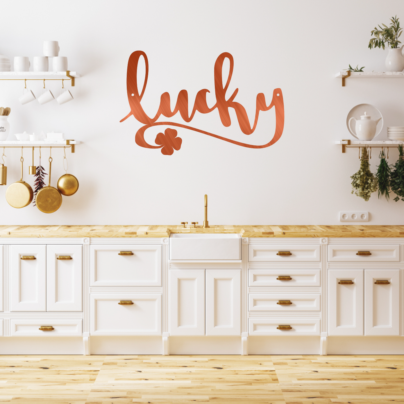 Looking for a unique piece of home decor? Look no further than Lucky. Made of durable 16 gauge steel, this powder coated metal art sign features the word "Lucky" in a elegant cursive font with a perfectly incorporated clover. Bring some good luck into your home with this one-of-a-kind piece.