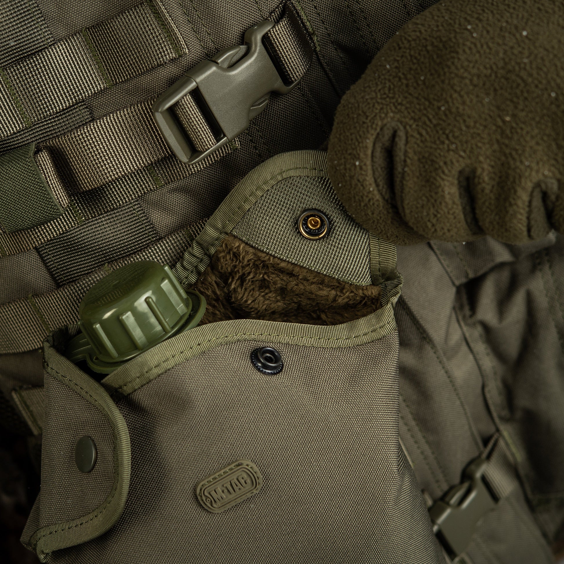 The M-Tac MOLLE pouch is designed for carrying a derived flask. Made of polyester, externally covered with a water-repellent layer of polyvinyl chloride. This summary is closed with two buttons. At the bottom there is an eyelet for moisture drainage. The bottom is sewn with a reinforced seam, which prevents damage and increases the service life. With the help of straps, the pouch can be attached to the MOLLE interface on a vest or even to the regular belt.