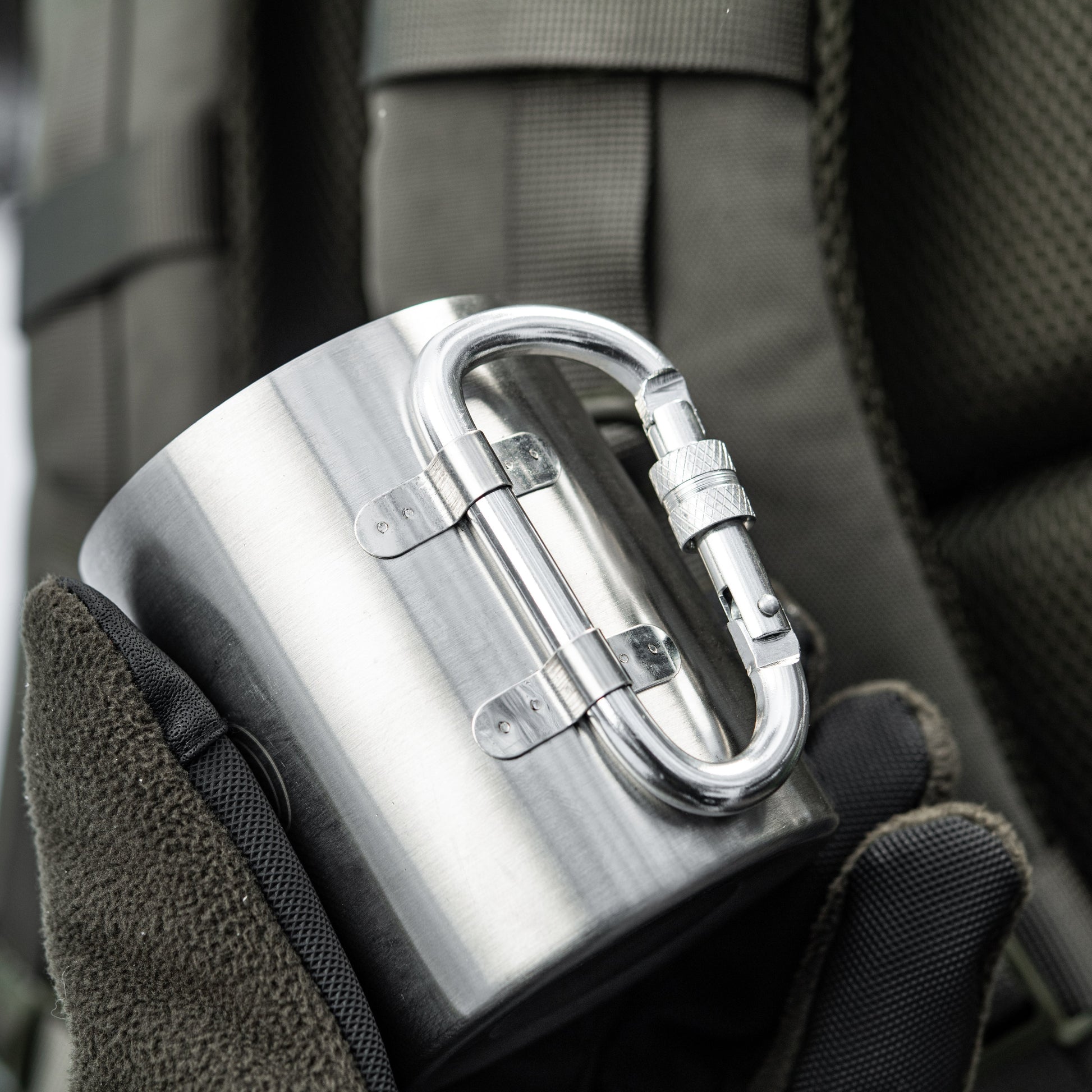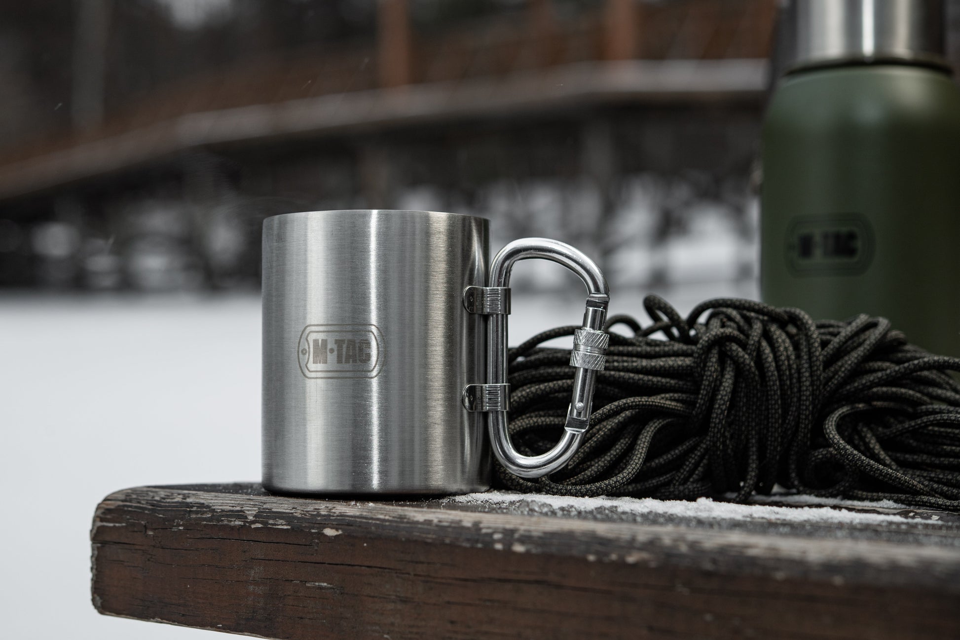 The M-Tac thermo mug is made of stainless steel and has a rigid and strong structure. Two-layer walls, an airtight layer, and a vacuum do not allow the drink to cool and heat the outer walls. Therefore it is not necessary to be afraid to be scorched by such a cup. The carbine was used instead of a handle, that can be used to clip the mug to your bag or backpack.
