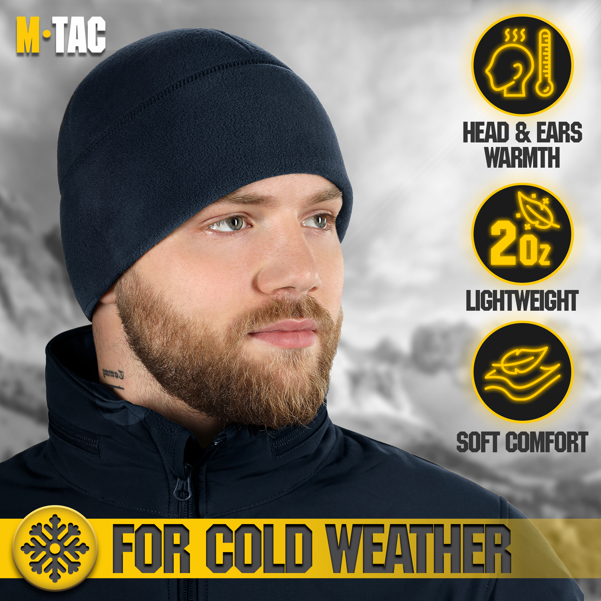 The M-Tac's lightweight and warm fleece hat for cold and extra cold weather. The beanie hat is made of microfleece with a density of 270 grams, which makes it lighter than even the finest wool. The black tactical beanie doesn't saturate the moisture and dries quickly. It also prevents itching and irritation. The low profile design fits easily under the helmet and hood. The Slimtex is a unique modern insulation that reliably retains heat, creates a feeling of softness and comfort. Slimtex is hygroscopic and hypoallergenic, and has a low thickness and high thermal insulation, flexibility, elasticity, and durability. Using this particular insulation you get reliable warmth without unnecessary bulk.
