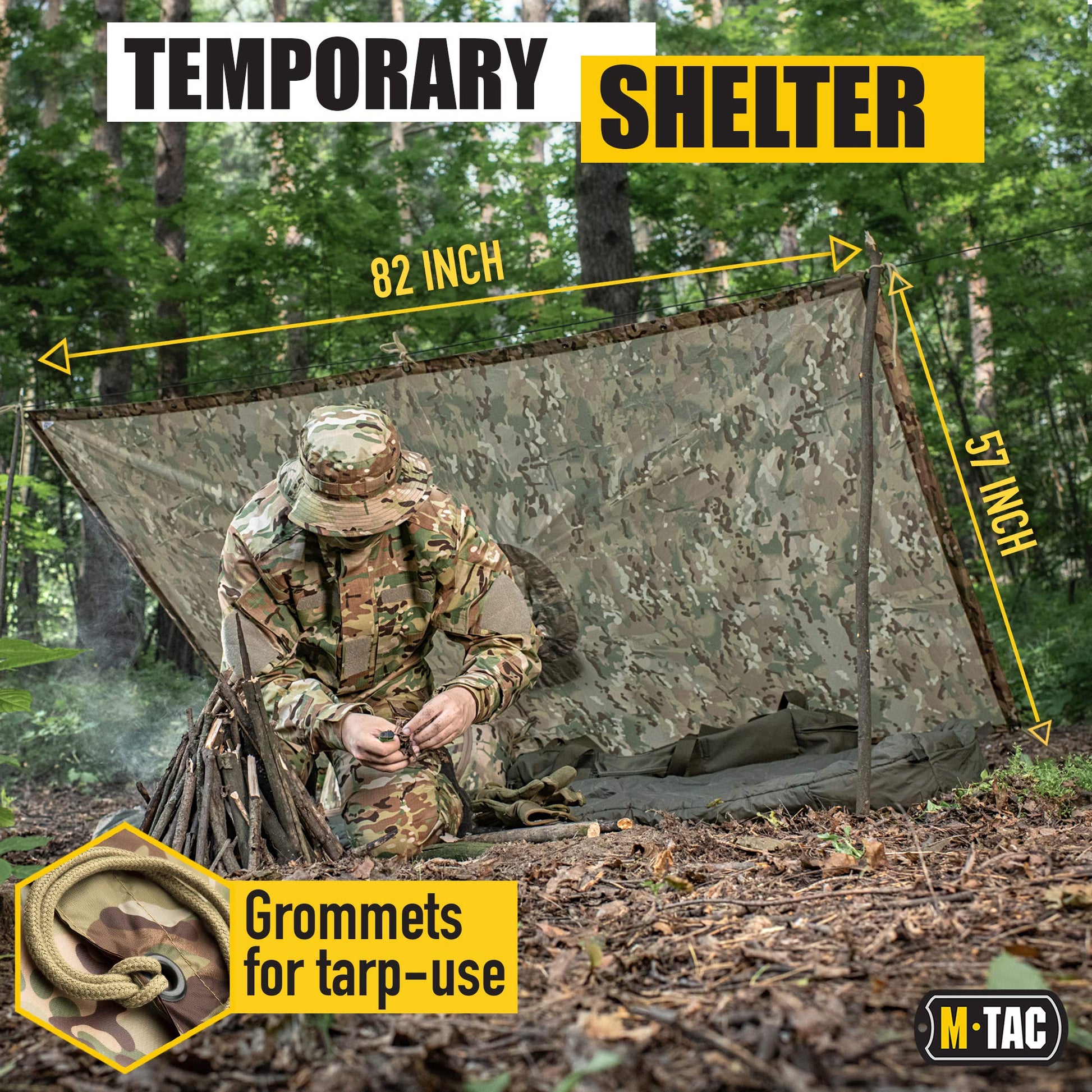 The copy of an American poncho made by the M-Tac brand. Material - 100% polyamide. Fabric - Rip-Stop. Complete set - poncho and portable bag. The waterproof poncho itself has universal functionality. It can be used as outerwear in the form of a raincoat, awning, or tent - a temporary shelter. The waterproof rain poncho for men has buttons, eyelets, and tension ropes.