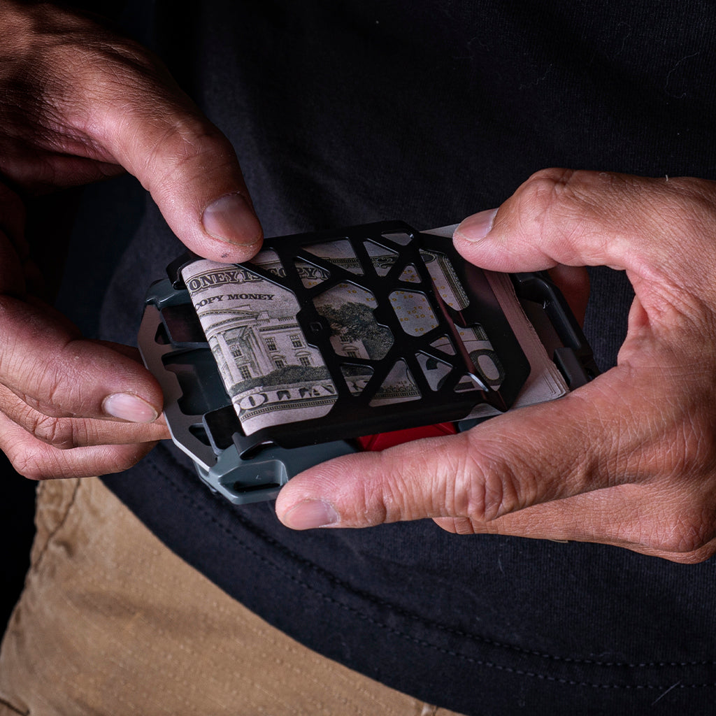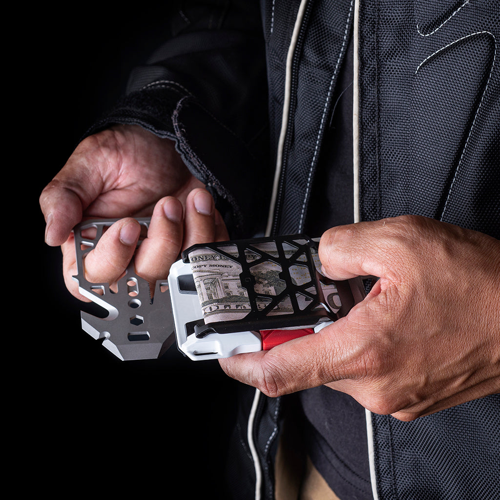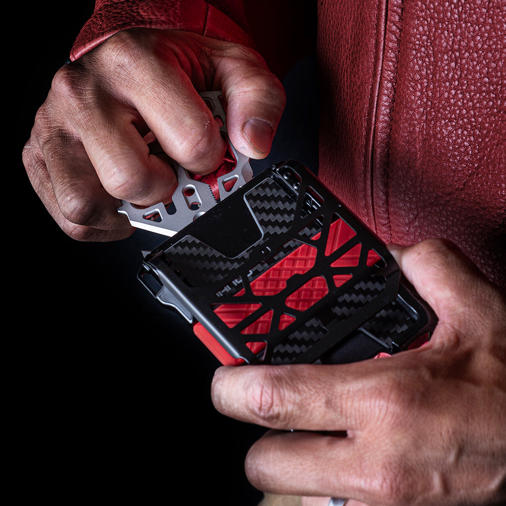 The MT04 Multi-Tool made of high carbon, heat treated stainless steel. It has over 10 functions that are specifically designed to respond to emergency situations. The functions of the multi-tool include: a seat belt cutter, serrated/sharpened edges, chisel, 2 paracord tensioners, an O2 oxygen wrench, nail pryer, standard 1/4” inch hex wrench, and of course, a bottle opener. The MT04 Multi-Tool slides into the metal cavity of the M1 series wallets, where cards sit on top of and is nested securely onto the safety locks on the chassis.