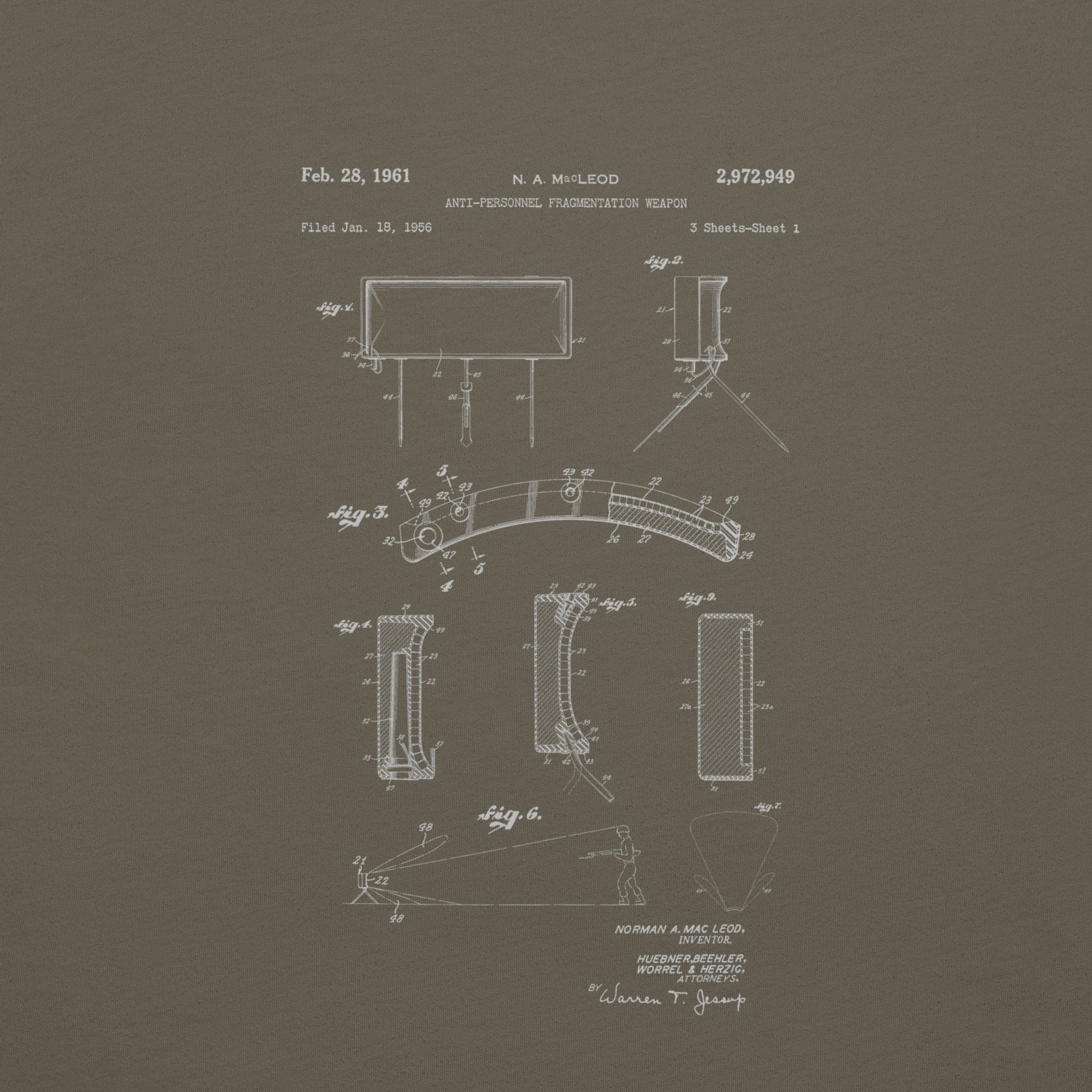 Step into the world of historical military innovation with our Vintage Patent Series T-shirt, showcasing the authentic blueprint of the iconic M18A1 Claymore anti-personnel mine. This unique design features the original patent filed by Norman A. MacLeod in 1956, a piece of history that revolutionized perimeter defense tactics.