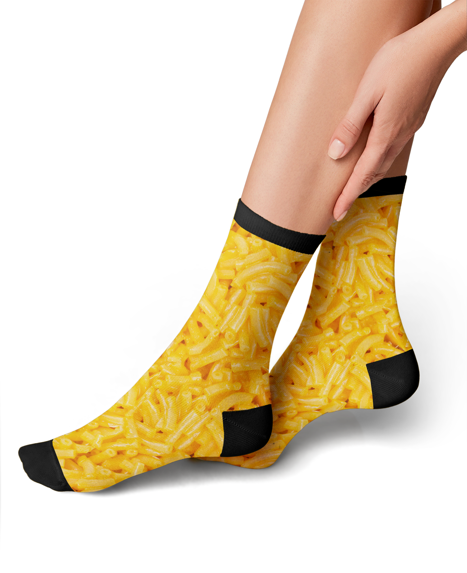Indulge in a delicioso pair of Mac and Cheese 360 socks! Perfect for those who love pasta or just cheesy things in general. These yellow socks are covered in macaroni and cheese in a 360-degree pattern, so you can enjoy your favorite comfort food from any angle. They're soft, comfy, and machine-washable, making them the perfect choice for your next sock-wearing adventure.
