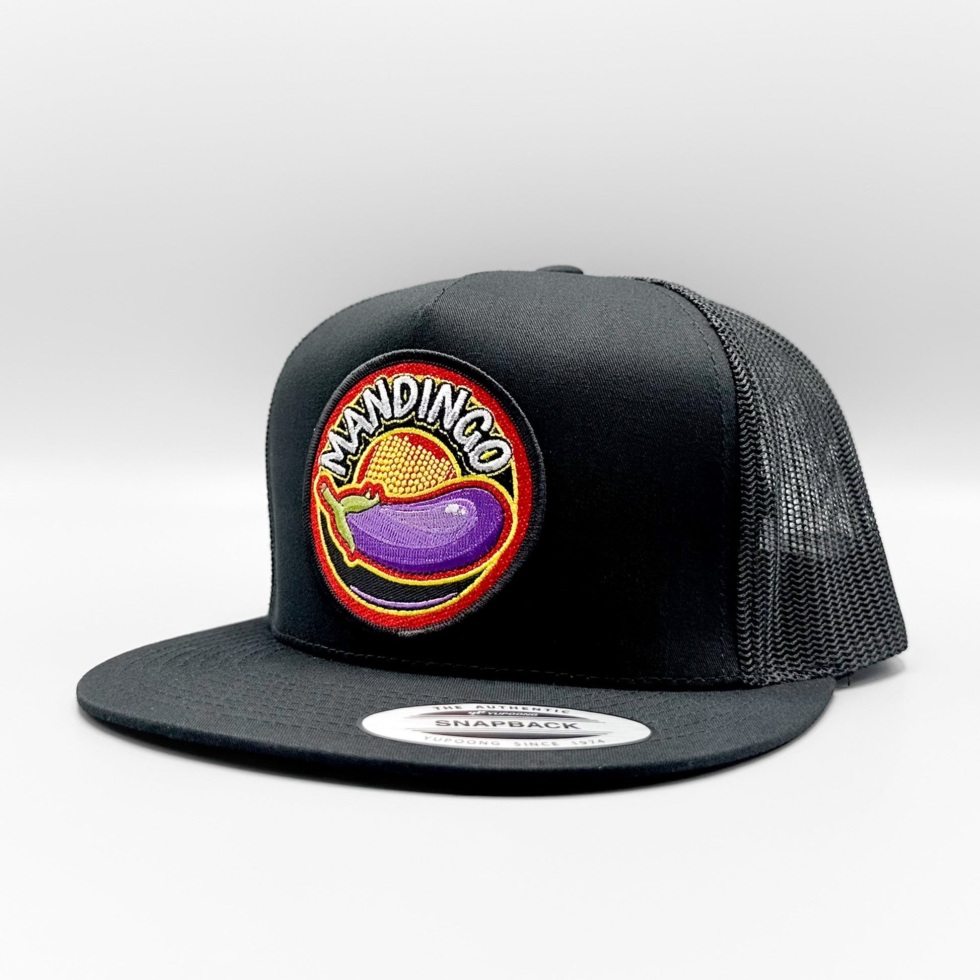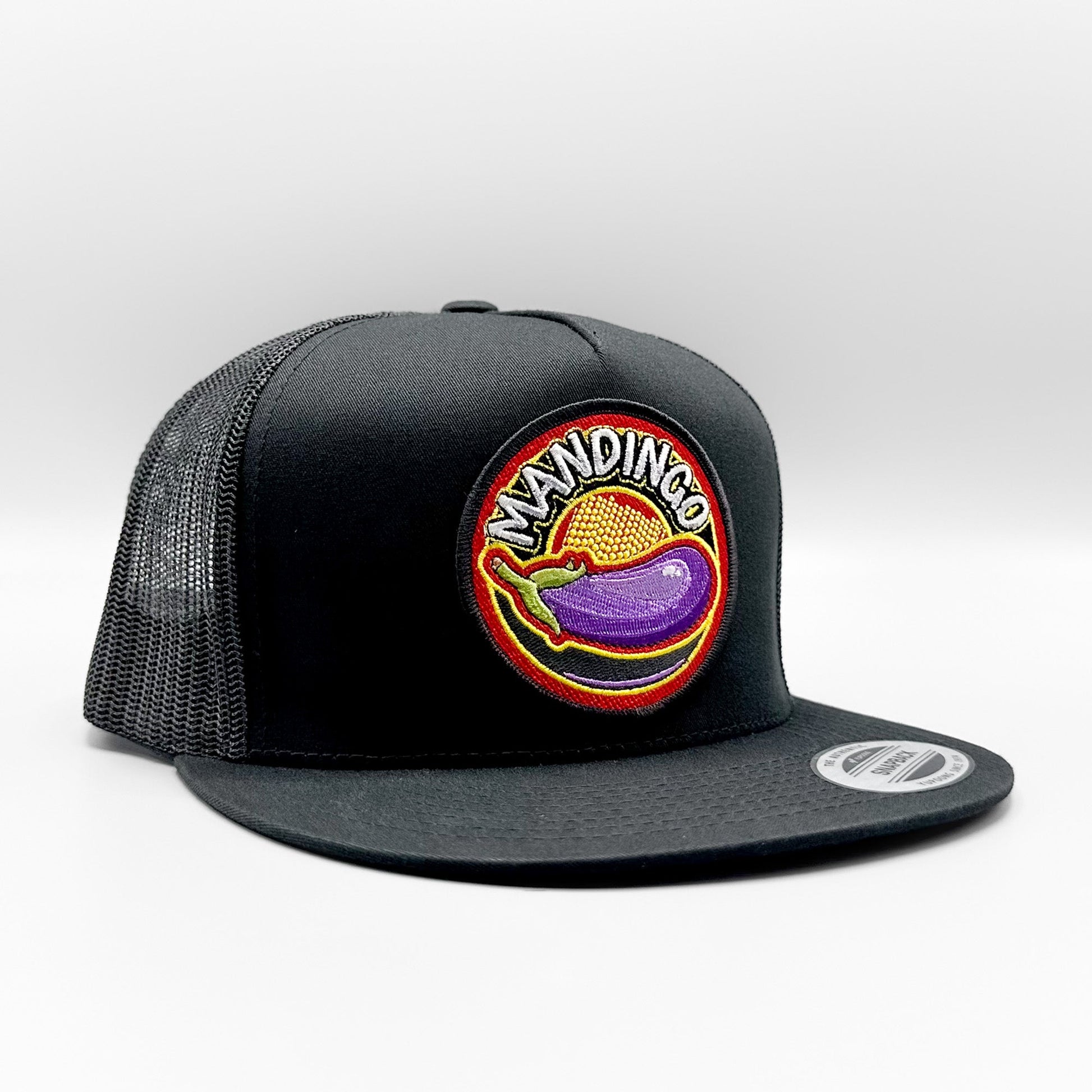 Funny Mandingo eggplant embroidered patch on black Yupoong 6006 Classic trucker hat.