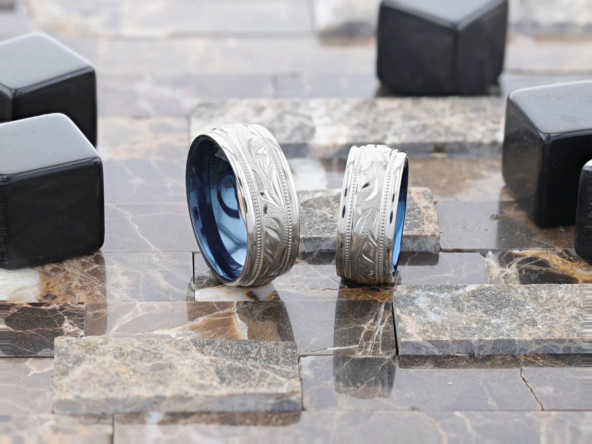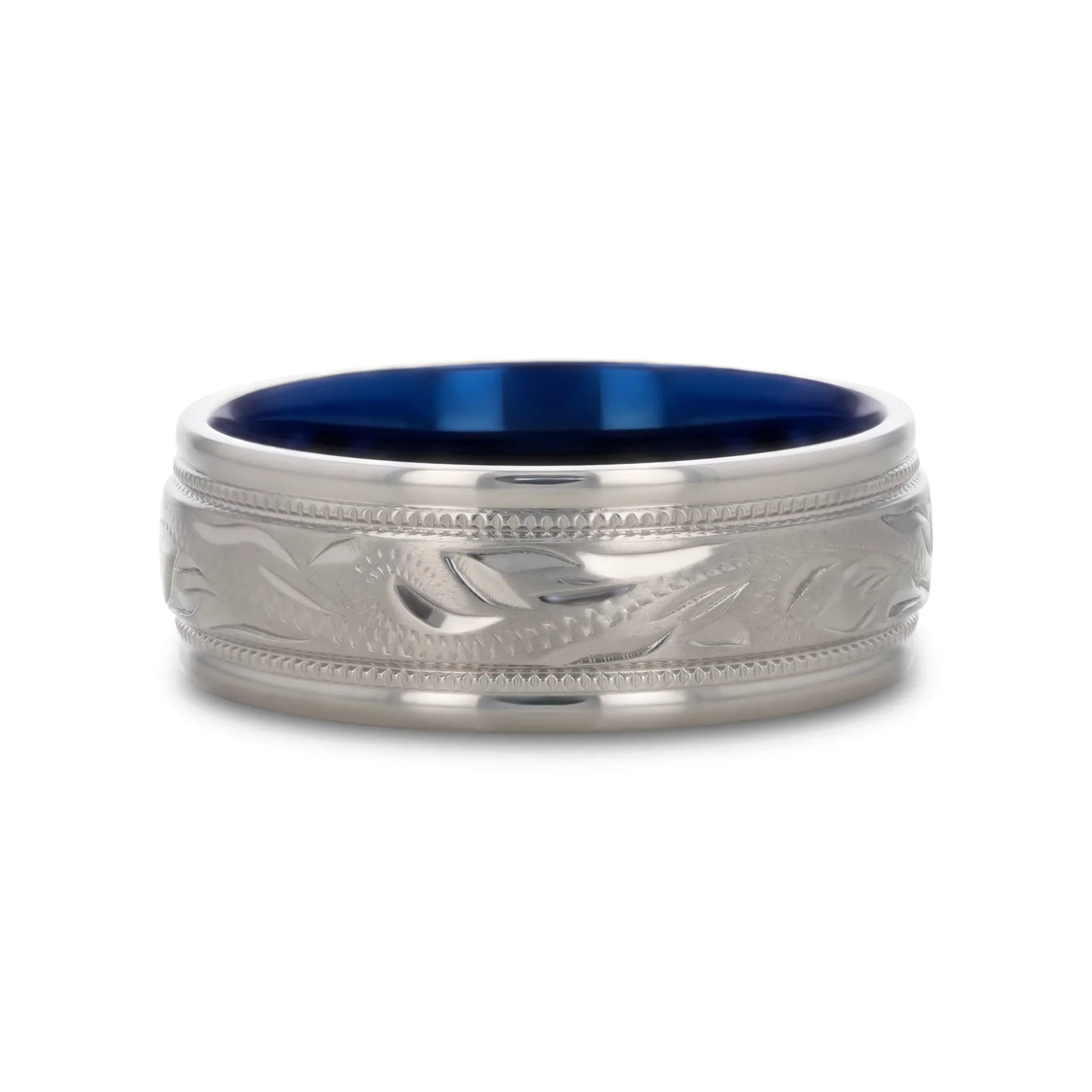 MARINER Titanium Milgrain Engraved Finish Men’s Wedding Ring with Blue Plating Inside - 8mm