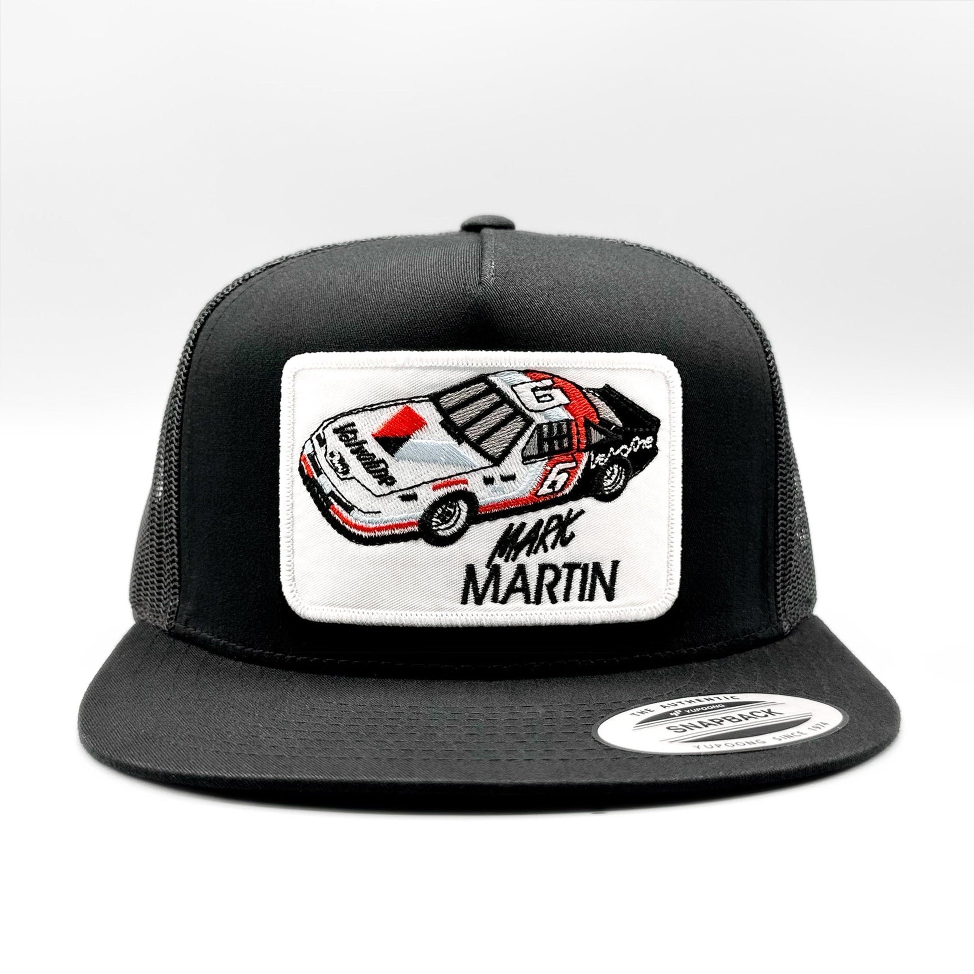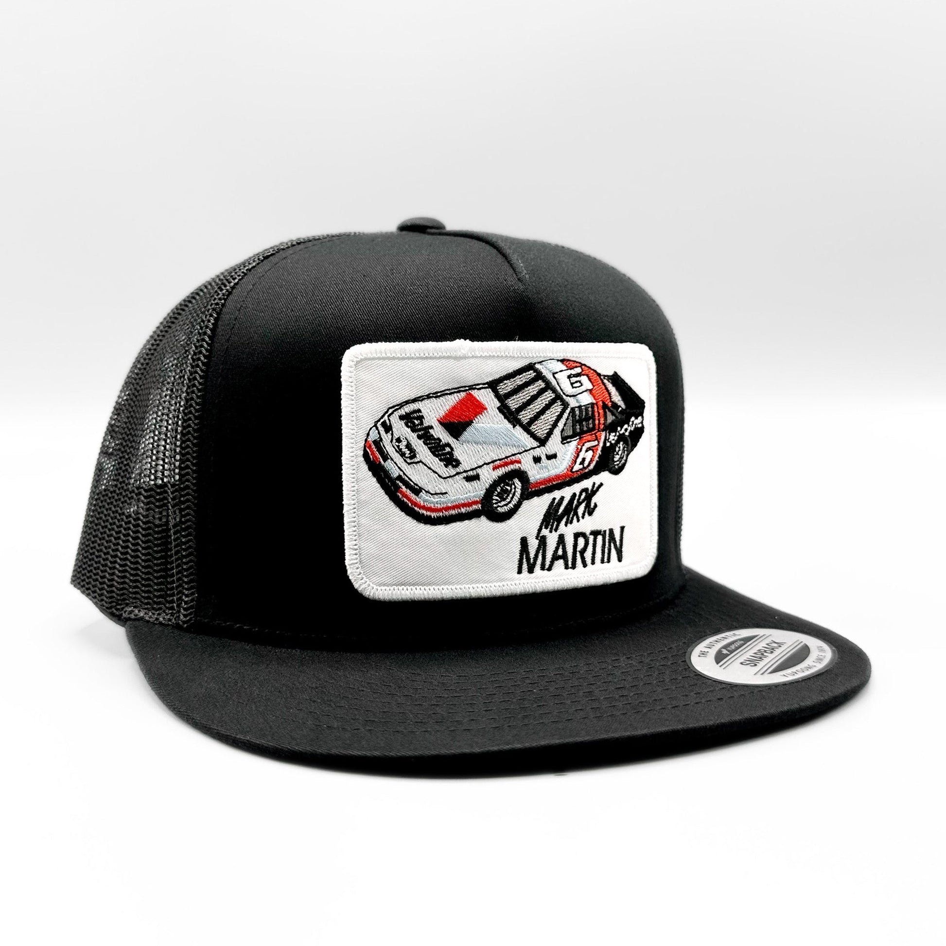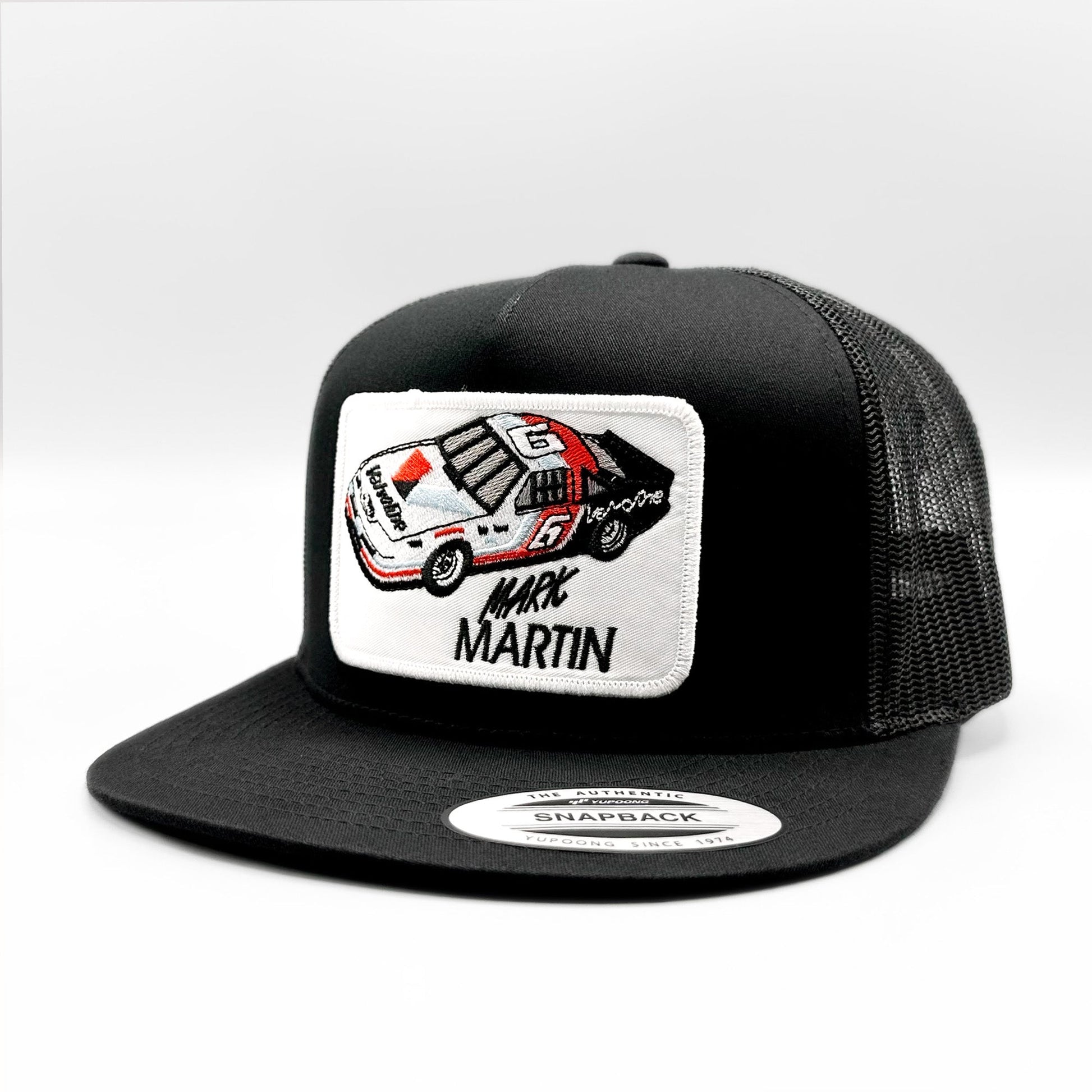 This trucker hat features retro Nascar Mark Martin #6 embroidered logo patch on an all black, premium Yupoong 6006 Classic snapback baseball cap.