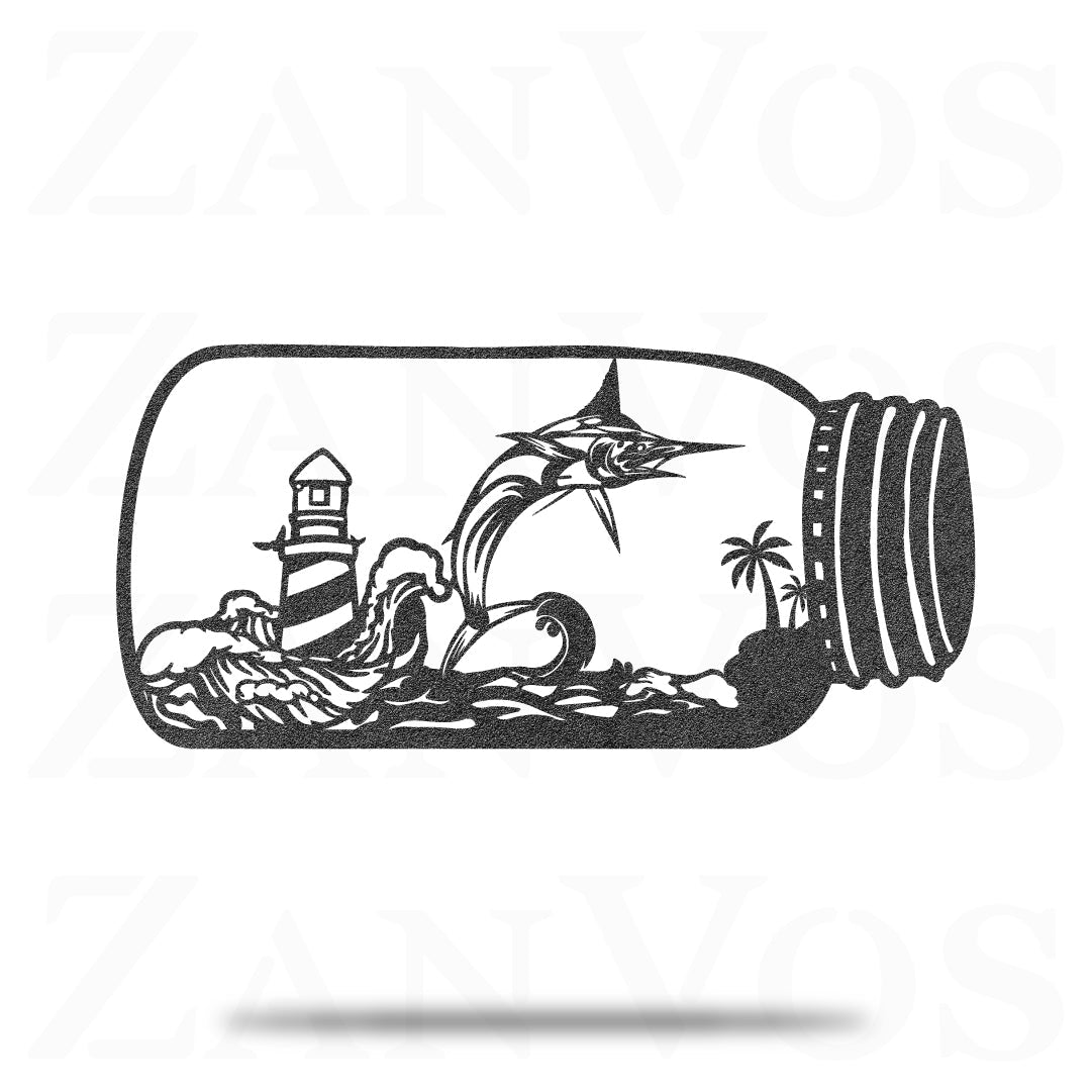 This unique wall decor features a captivating jar silhouette containing a lighthouse and a marlin fish leaping inside. Crafted to spark curiosity and add a nautical charm, it offers a supportive way to bring intrigue and coastal inspiration to your living space.