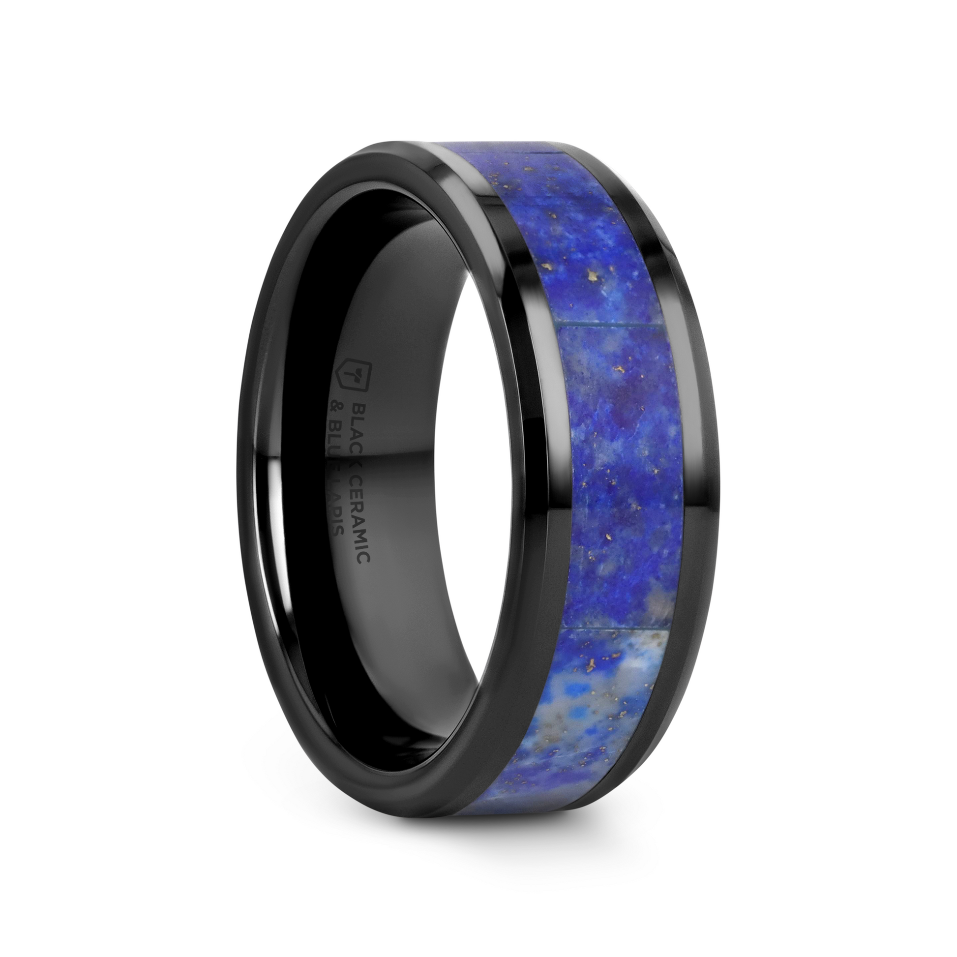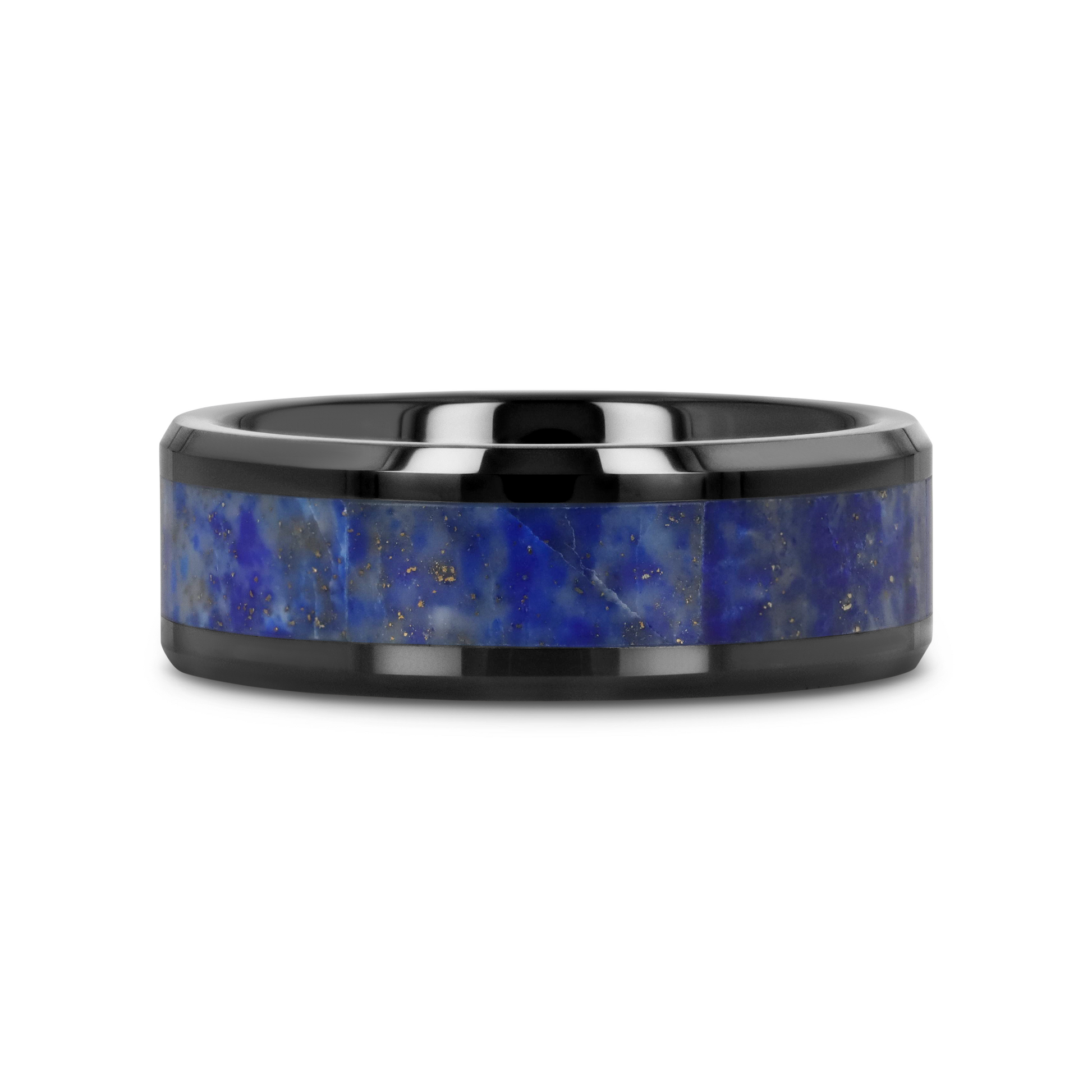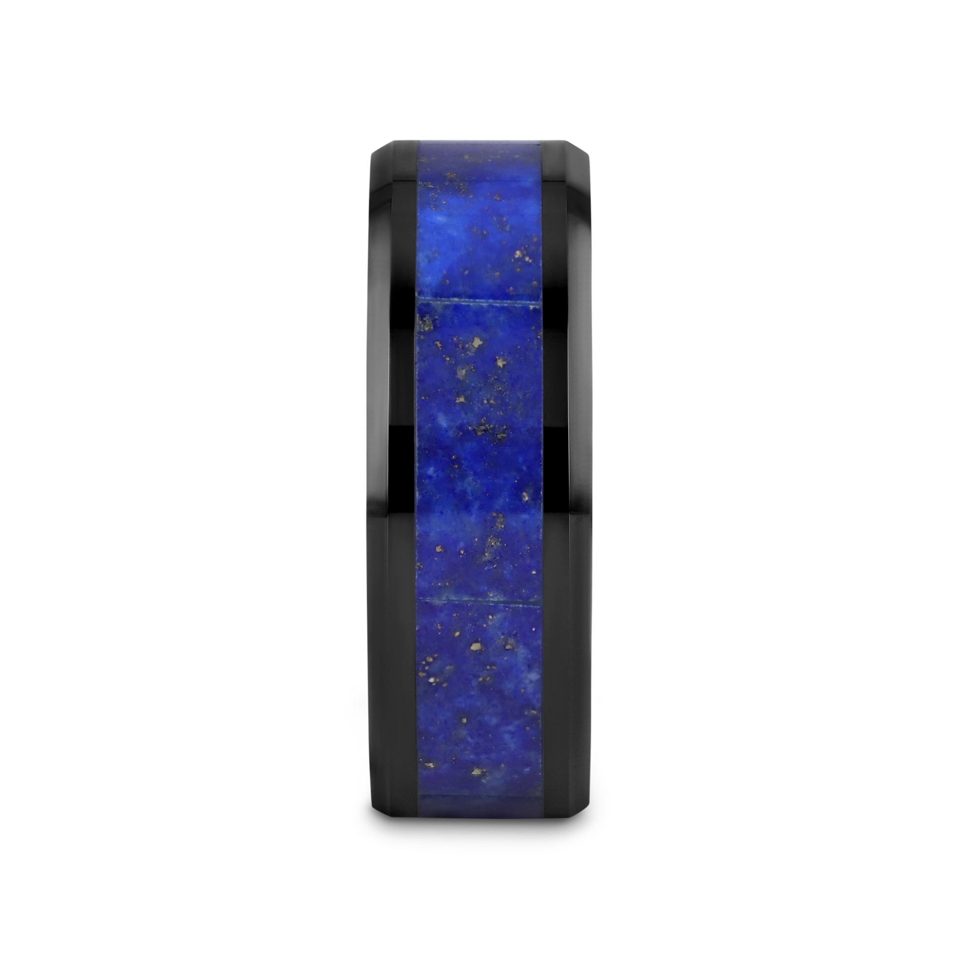 MARLOW Men’s Polished Black Ceramic Wedding Band with Blue Lapis Inlay and Beveled Edges - 8mm