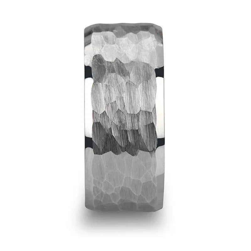 MARTEL White Tungsten Ring with Hammered Finish and Polished Bevels - 10mm