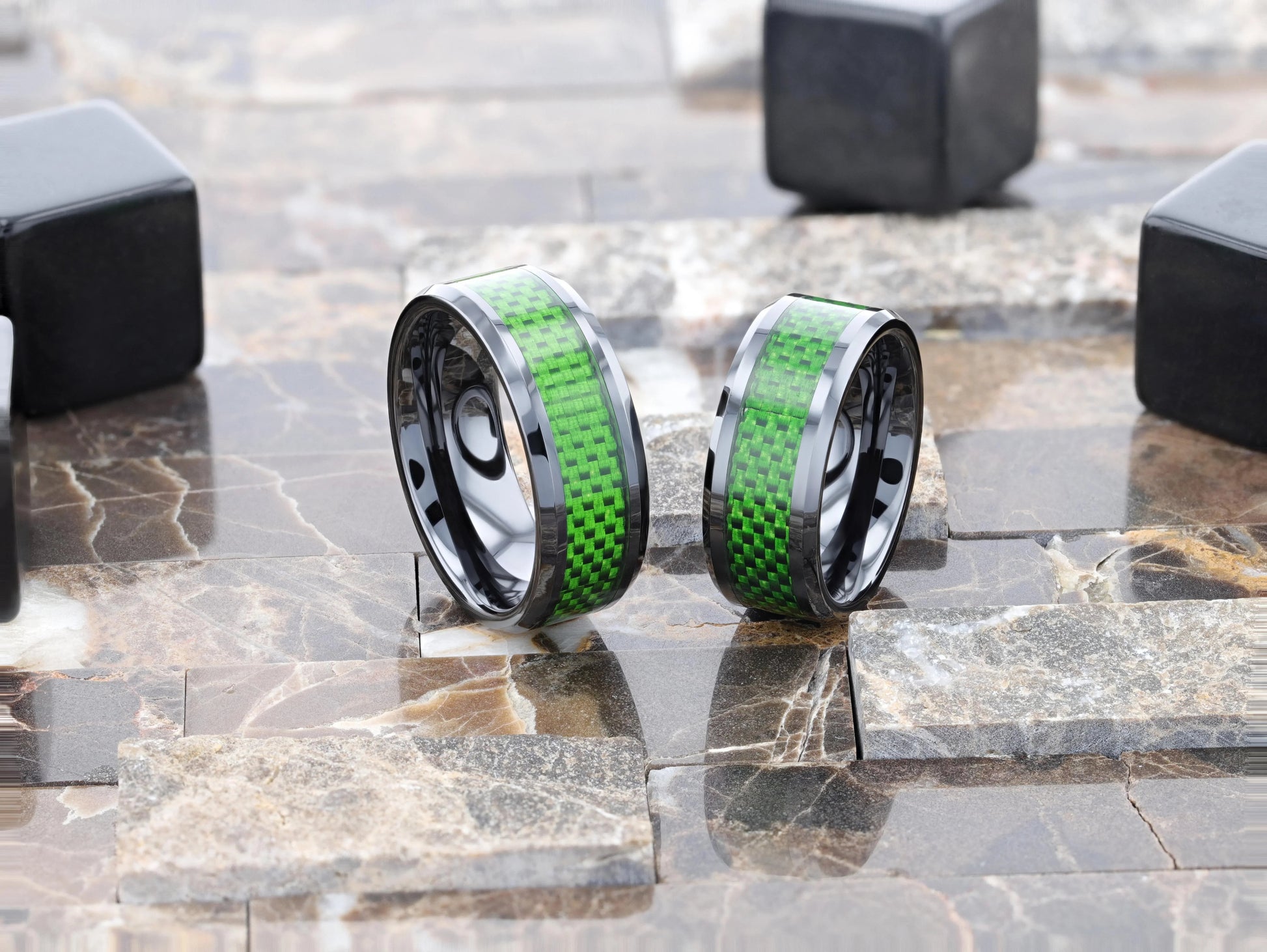 This hard to find wedding band style has the look of Black Tungsten Rings but, is actually a combination of high tech black ceramic with the cool look of carbon fiber. This comfort-fit band is 8 mm wide and has beveled edges. The beautiful emerald green color carbon fiber is extremely rare and hard to find. This is the perfect wedding band to represent your love.