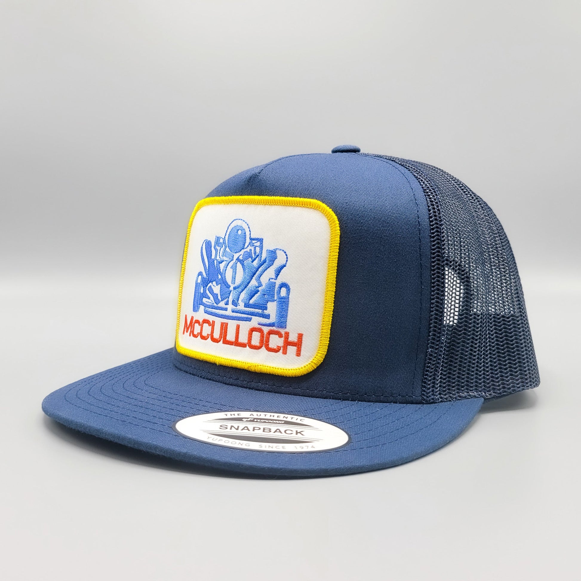 This trucker hat features a McCulloch Go-Kart Racing Team embroidered patch on a premium navy Yupoong 6006 Classic high-crown, mesh snapback baseball cap.