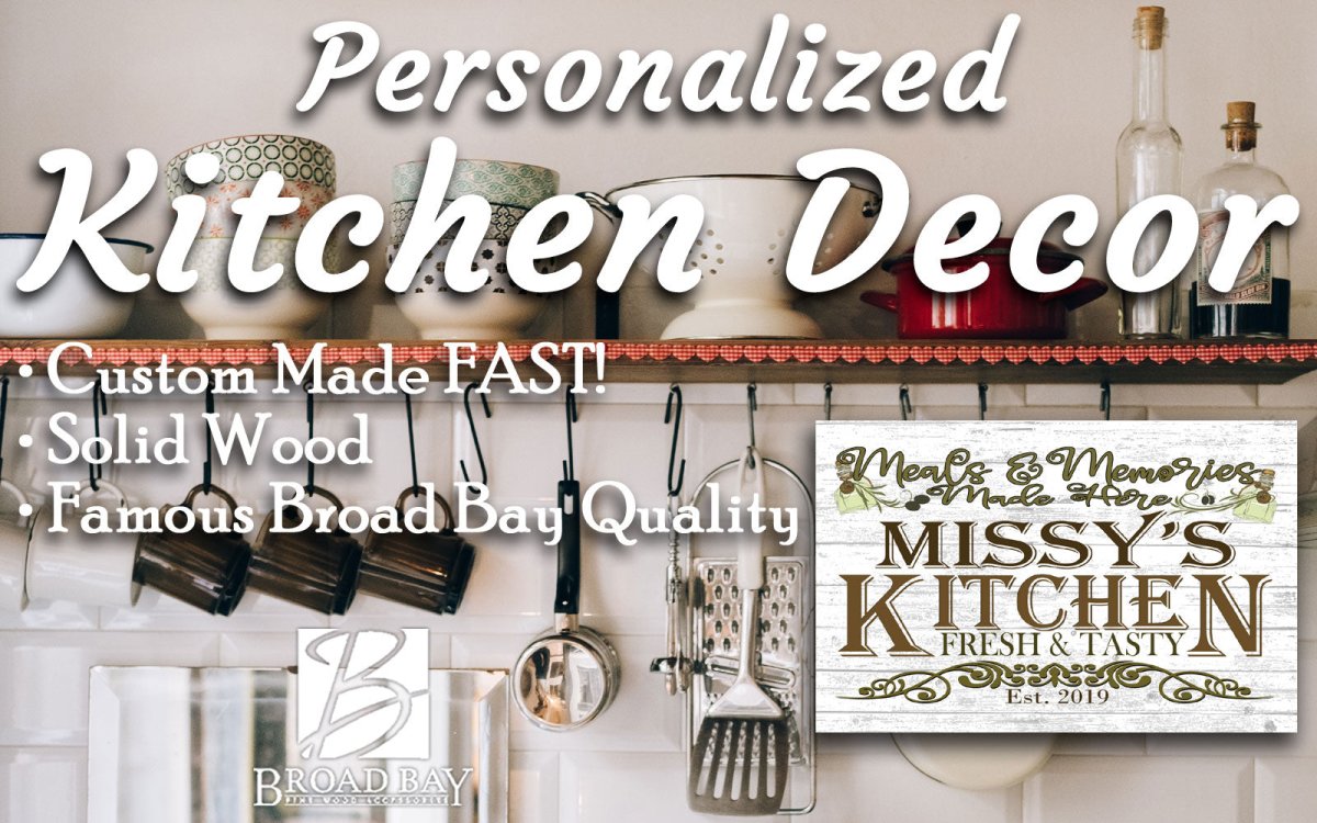 This personalized kitchen sign is the perfect unique personalized gift idea for her or him, any cook or chef! The farmhouse style kitchen design is personalized and printed on solid wood. Carefully crafted from solid wood this unique custom name rustic kitchen name hanging wood sign will be cherished for years to come and proudly displayed in any kitchen. The personalized artwork is carefully applied to the solid wood in a unique process developed by Broad Bay to allow the beauty of the wood to show through the customized kitchen name design. Personalized with the kitchen chefs name, this vintage look kitchen gift is the perfect personalized gift for Christmas or any occasion! Well Sized - 16.5in x 11in!