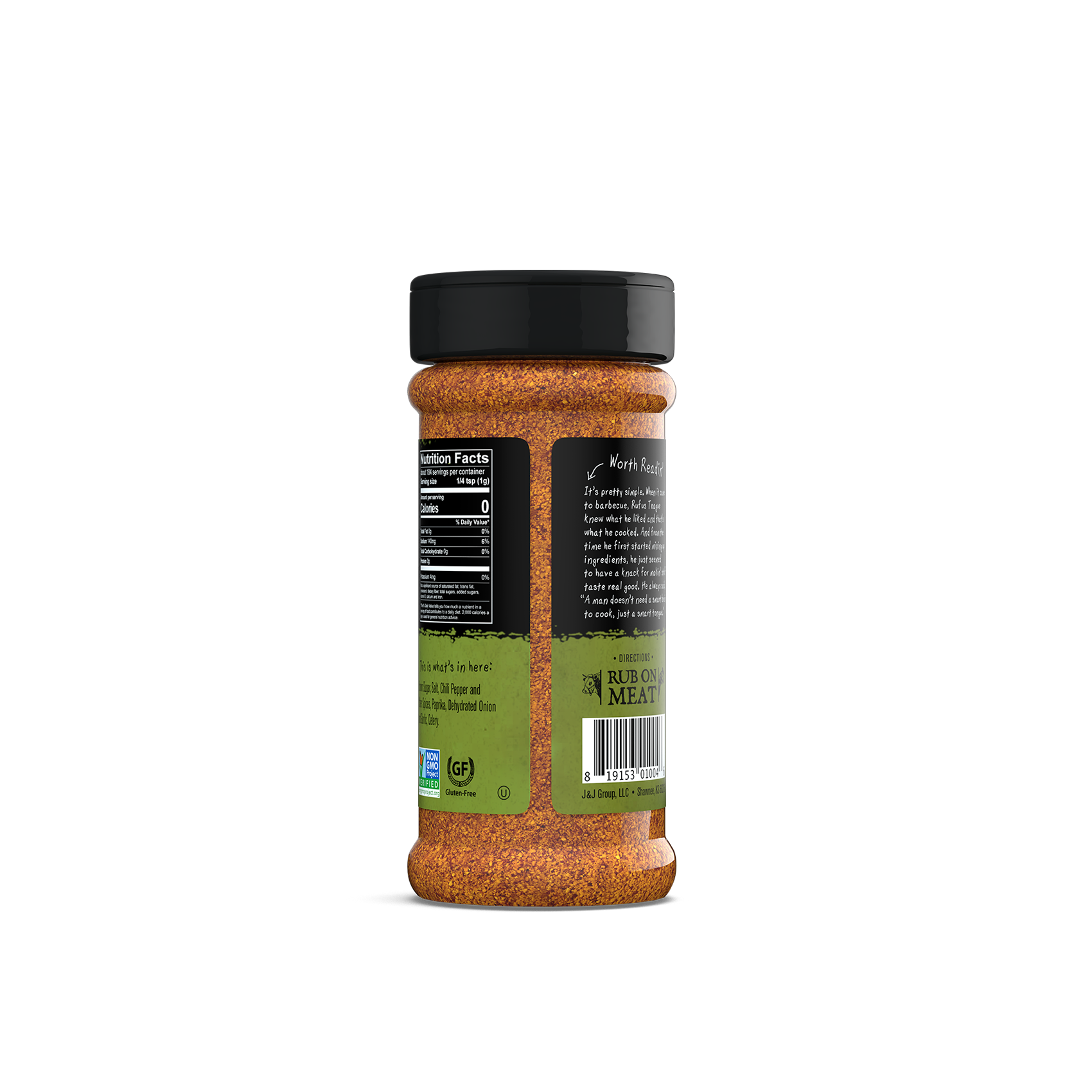 This is the real deal, not some cheap knockoff. Made with the finest ingredients, our rub is Gluten-free and Non-GMO verified. So, make your meat happy and remember, Rufus always said, “Good sauce makes bad barbecue good and good barbecue gooder.”