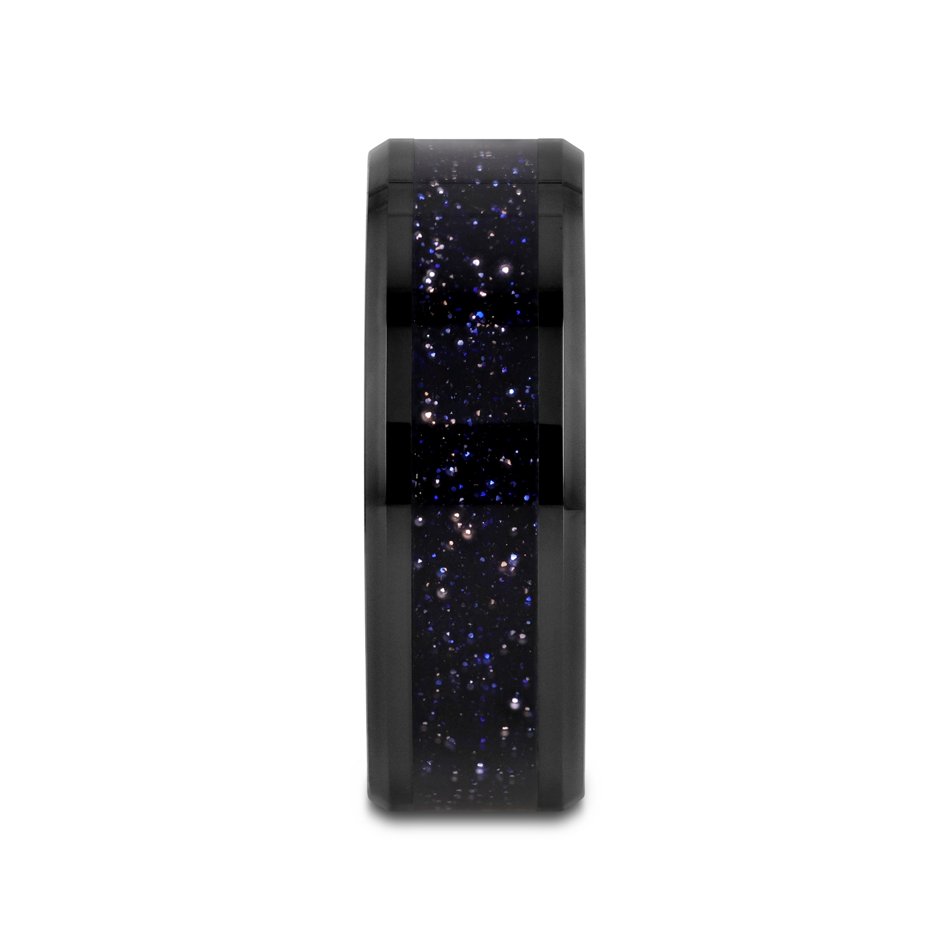 MELO Black Ceramic Beveled Polished Men’s Wedding Band with Purple Goldstone Inlay - 8mm