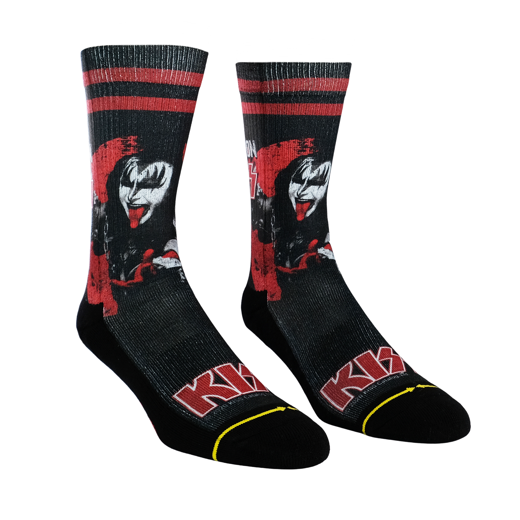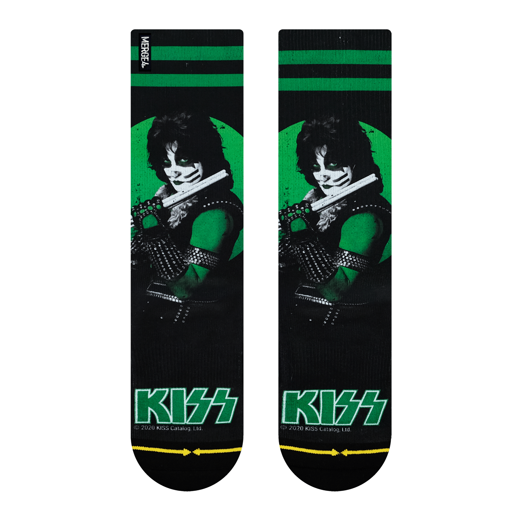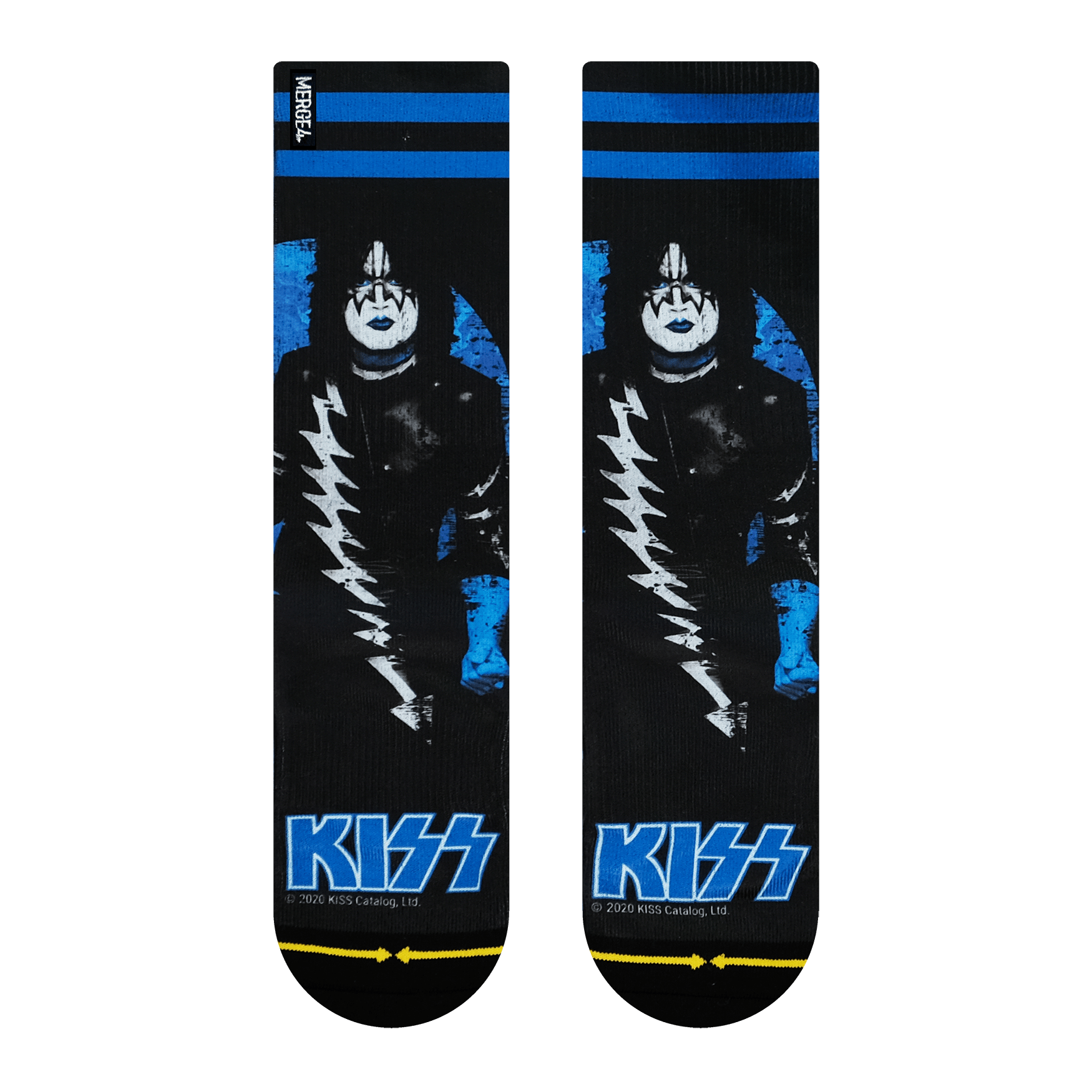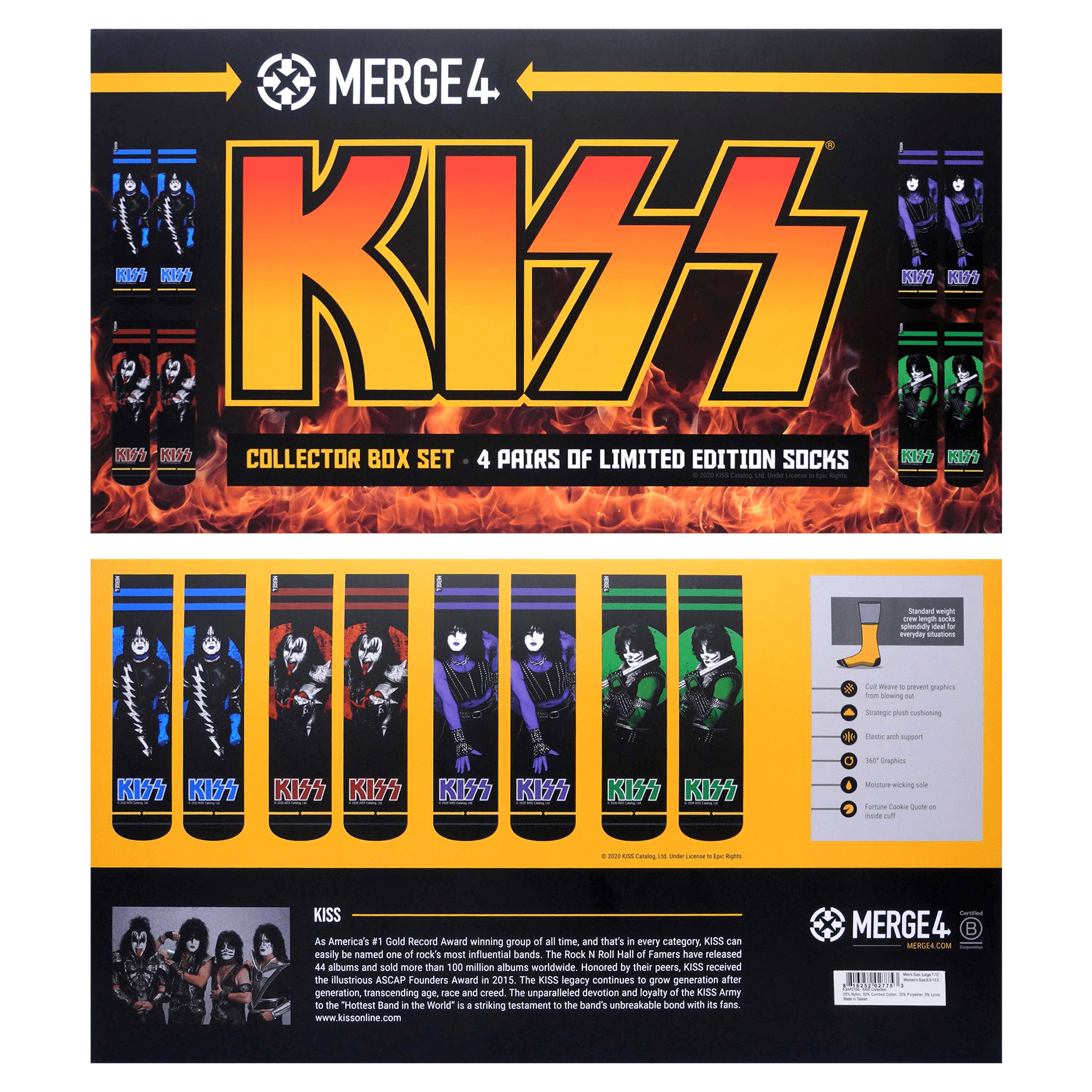 Introducing: The MERGE4 Kiss Collection Box Set. Four brand new KISS band socks all wrapped up in a limited edition box set. A must-have for every KISS fan, this KISS collectors' box includes four midweight crew socks featuring: The StarChild, The Demon, The Spaceman, and The Catman.
