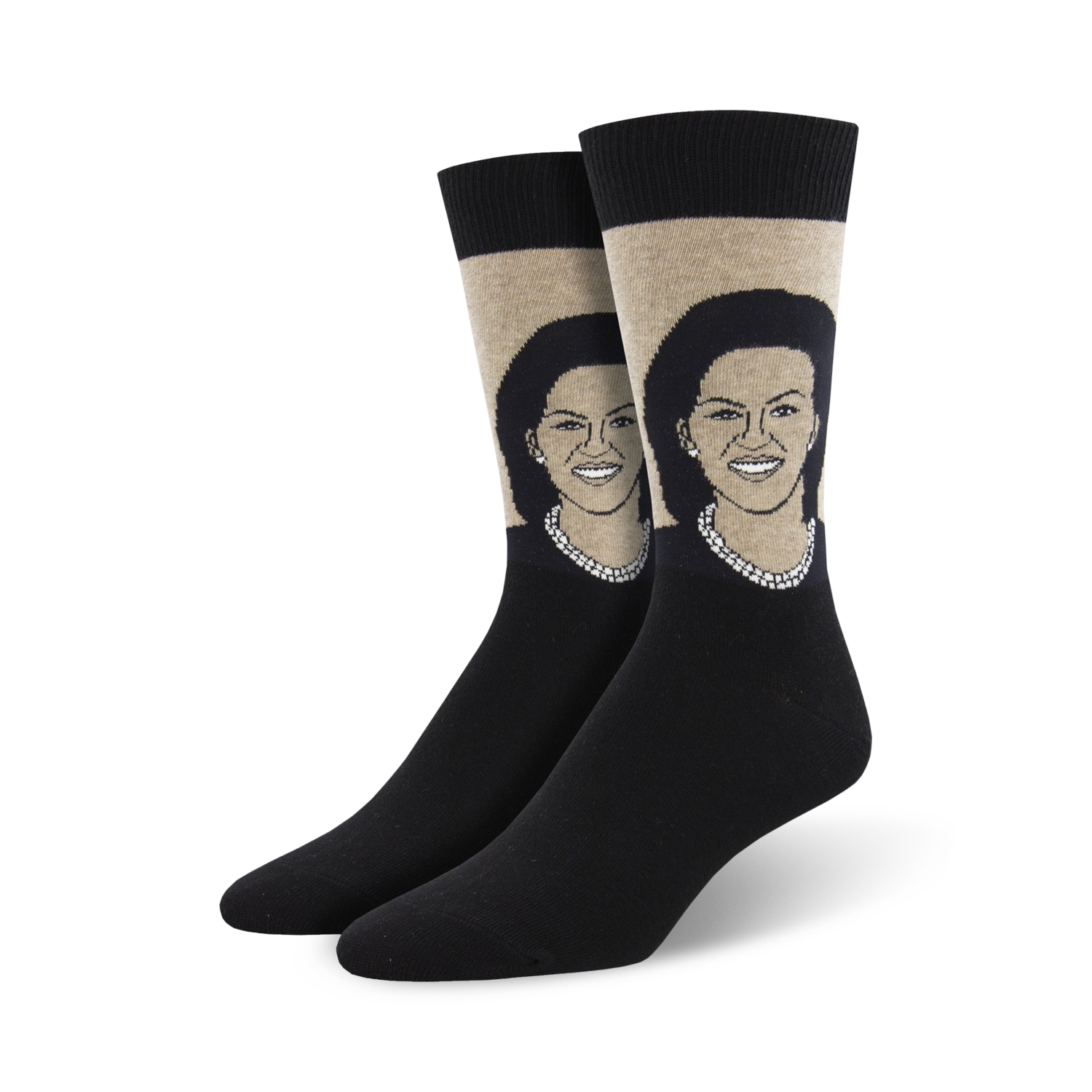 Michelle Obama Socks: Be the envy of the Oval Office, the Supreme Court, or wherever your feet take you in these black crew socks featuring a portrait of the forever First Lady herself, Michelle Obama.