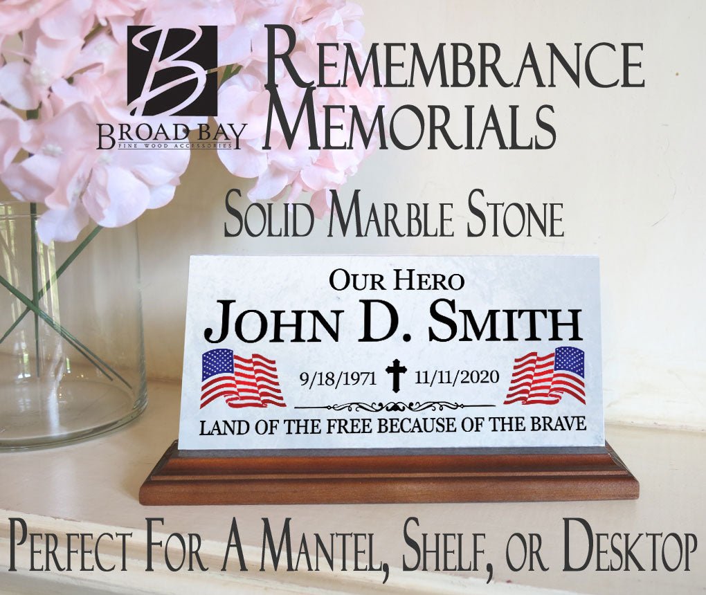 Celebrate the life of a beloved military hero with this personalized marble memorial plaque. Featuring two full-color American flags, your custom name, birth and passing dates, and a touching tribute message, this elegant desk plaque is a powerful way to honor a life of bravery and service. Perfect for display at home or in an office, it includes the timeless message: “Land of the Free Because of the Brave.”