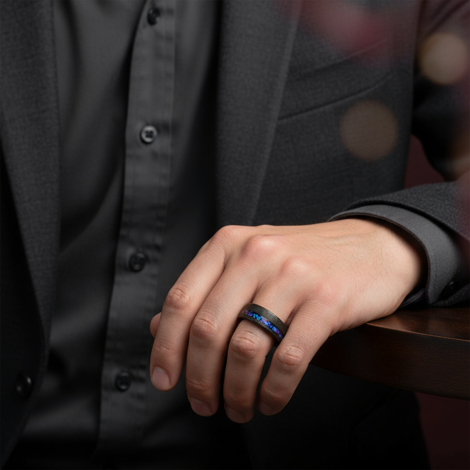 MIRAGE Sandblasted Black Tungsten Ring, featuring stunning Synthetic Crushed Alexandrite and Dark Blue/Purple Crushed Goldstone for a unique, bold look. Elegant and individual 8mm statement ring.