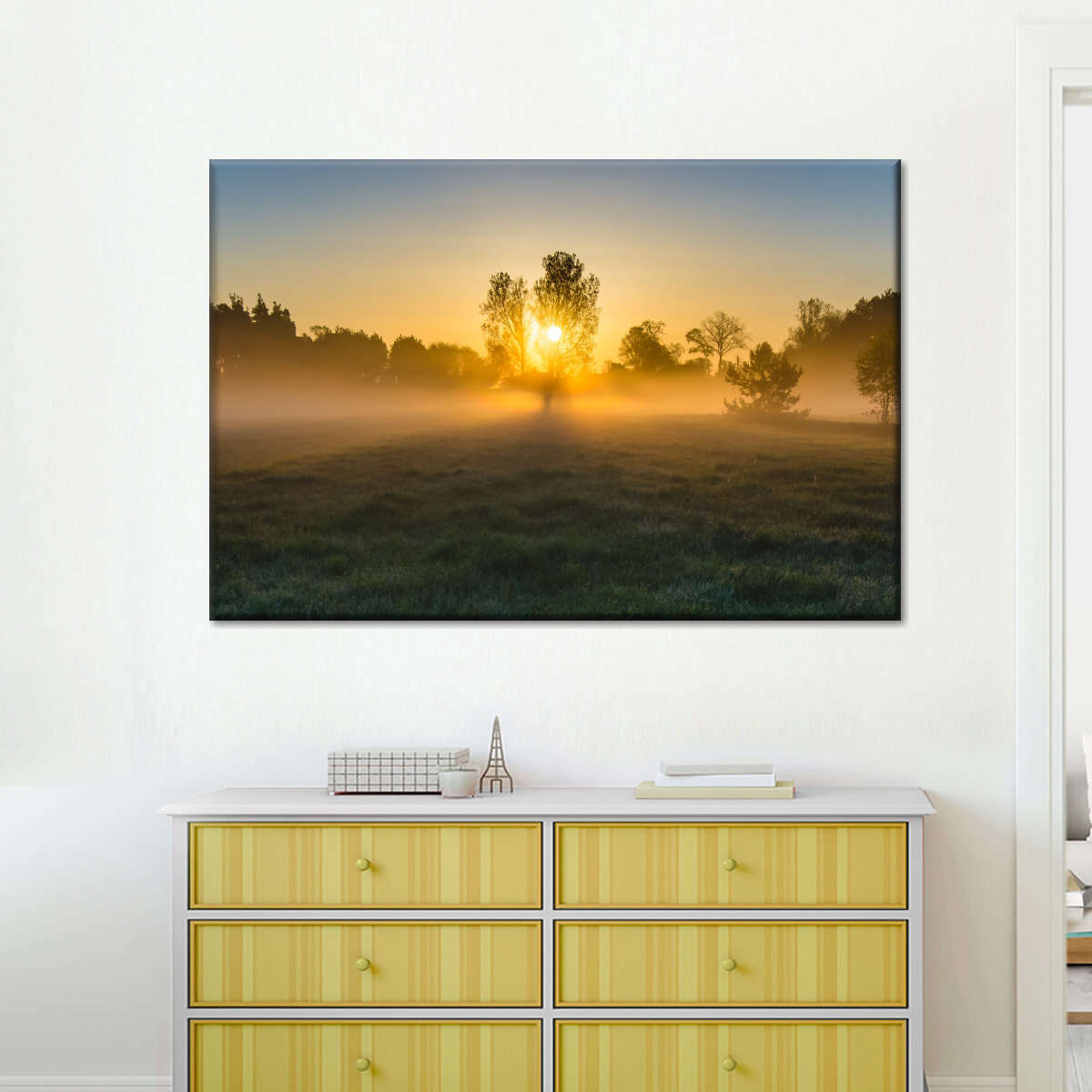 Misty Meadow At Sunrise Wall Art will refresh your mind and soul whenever you stop and stare at it. This high-quality art print will complement any room in your home and soothe your senses with nature's beauty.