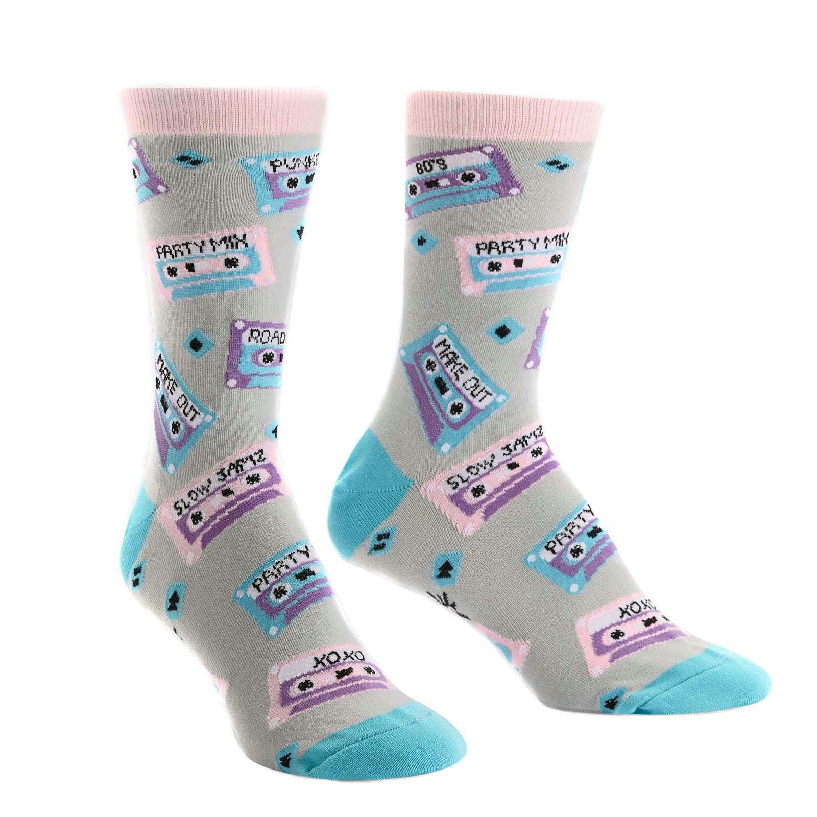 Fresh off the block! We've got a great new selection of mix tapes for every occasion. These cool socks will rewind you back to the 80's and 90's! Each hip pair comes in gray, pink, and blue featuring several different mix tapes. Some for making out, some for parties, even one for slow jams. Get your groove on!