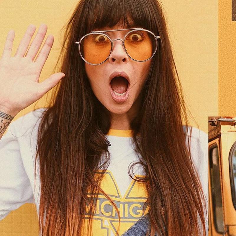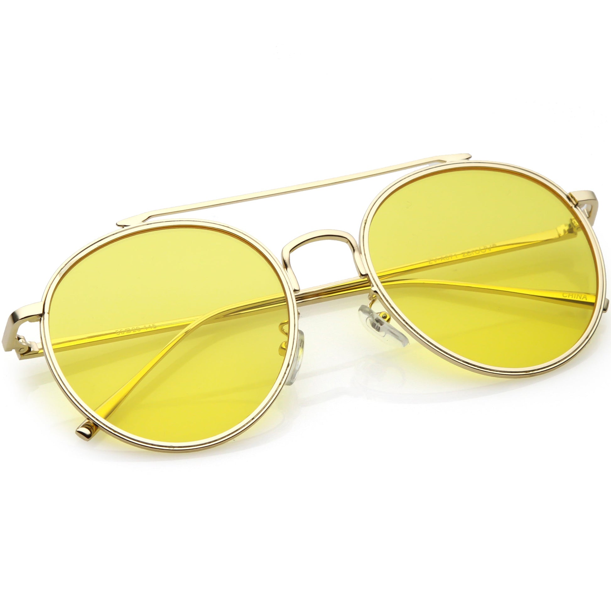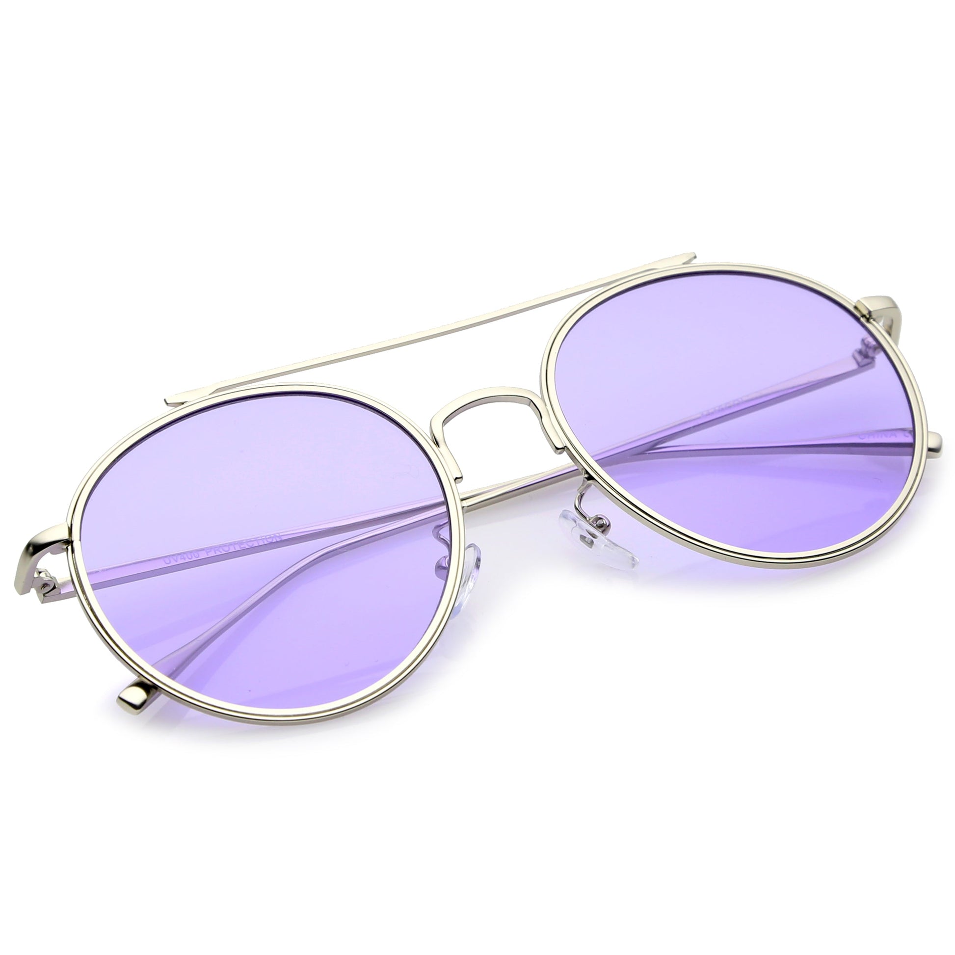 - A modern take on aviator design, these round metal aviators feature a straight crossbar and slim metal temples. Finished with round flat lenses in colorful hues, these round aviators are a must-have style. Made with a metal based frame, English style nose pieces, metal hinges, and polycarbonate UV400 protected lenses.