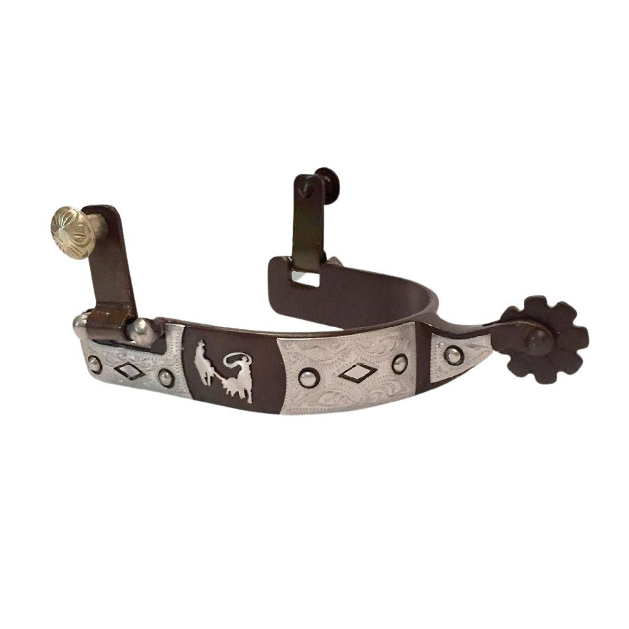 This a short shank, antique brown spur with a 1" band and nickel silver overlay. 1 1/4" shank with 1" low impact rowel. Designed to be used and sit well on a boot.