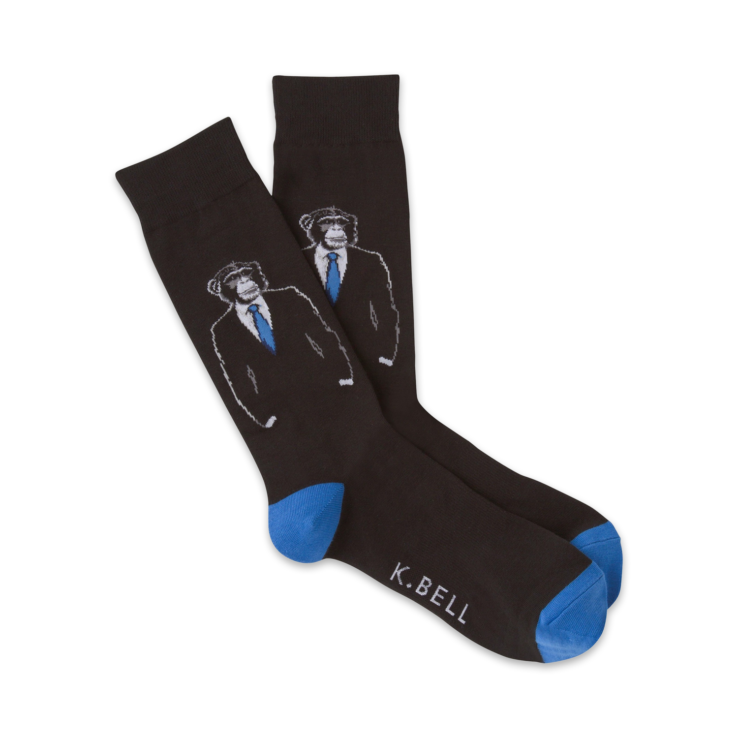 Why do you always have such a chimp on your shoulder? Maybe you need a cool new pair of socks to match that suit of yours. This funny pair of black and blue crew socks features a business chimp in a classy suit. Don't be a run of the mill monkey when you can be a CHIMPion!
