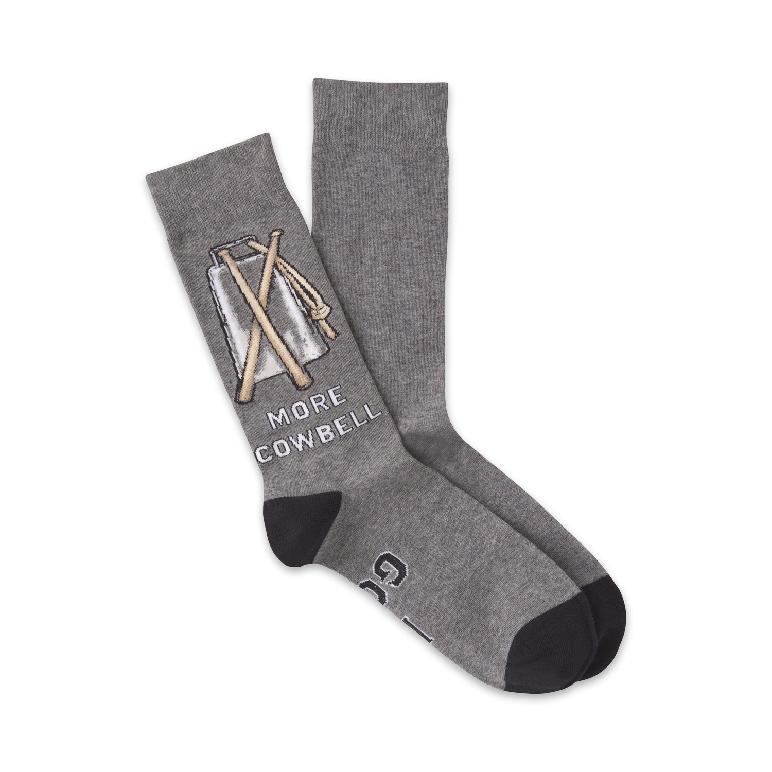 These More Cowbell socks are the perfect way to add a little fun and energy to your everyday wardrobe. With their gray base, black toes and heels, and a picture of a cowbell with drumsticks and the words 'MORE COWBELL' written vertically on the side, these crew socks are sure to get you noticed. Show your love for music and fun with every step you take!