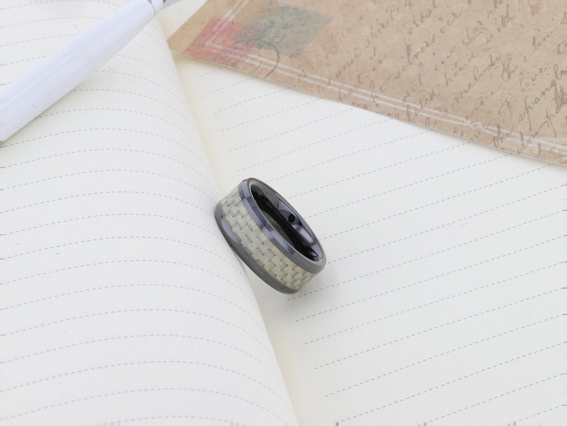 MYSTIQUE Beveled White Carbon Fiber Inlaid Ceramic Ring - 8mm