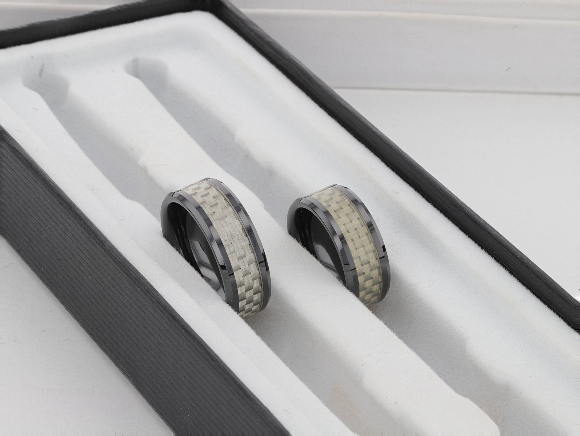 MYSTIQUE Black Ceramic Beveled Wedding Band with White Carbon Fiber Inlay – 8mm