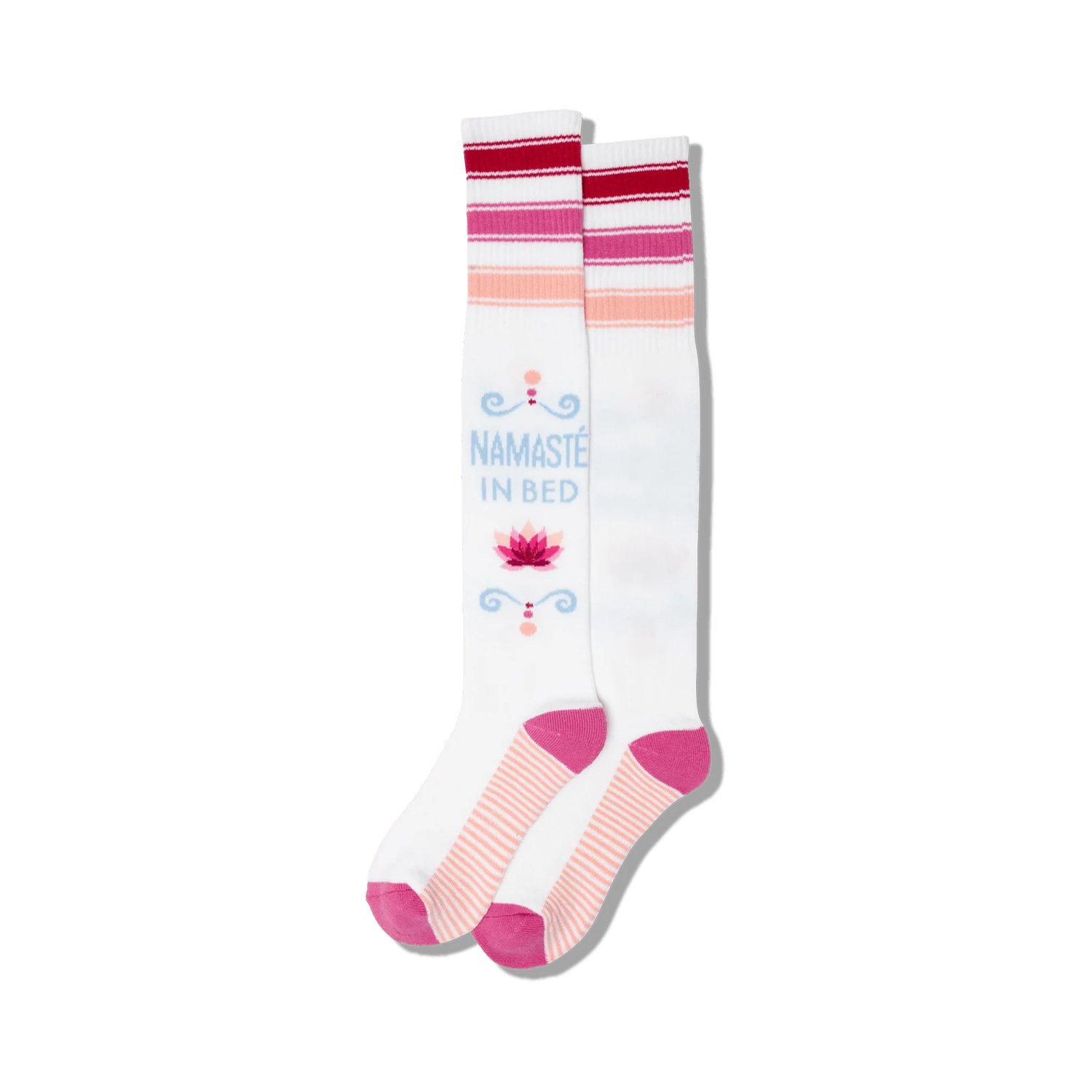 Namaste is more than just a Sanskirt word that means hello and goodbye. It is a way to pay respect and homage too. Each cool pair of women's knee high novelty socks feature the word "Namaste in Bed" printed on the sides. There is a beautiful lotus displayed beneath the words against a white background. Gift these awesome socks to your favorite yoga instructor or the yoga lover in your life.