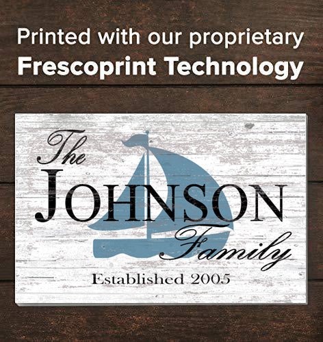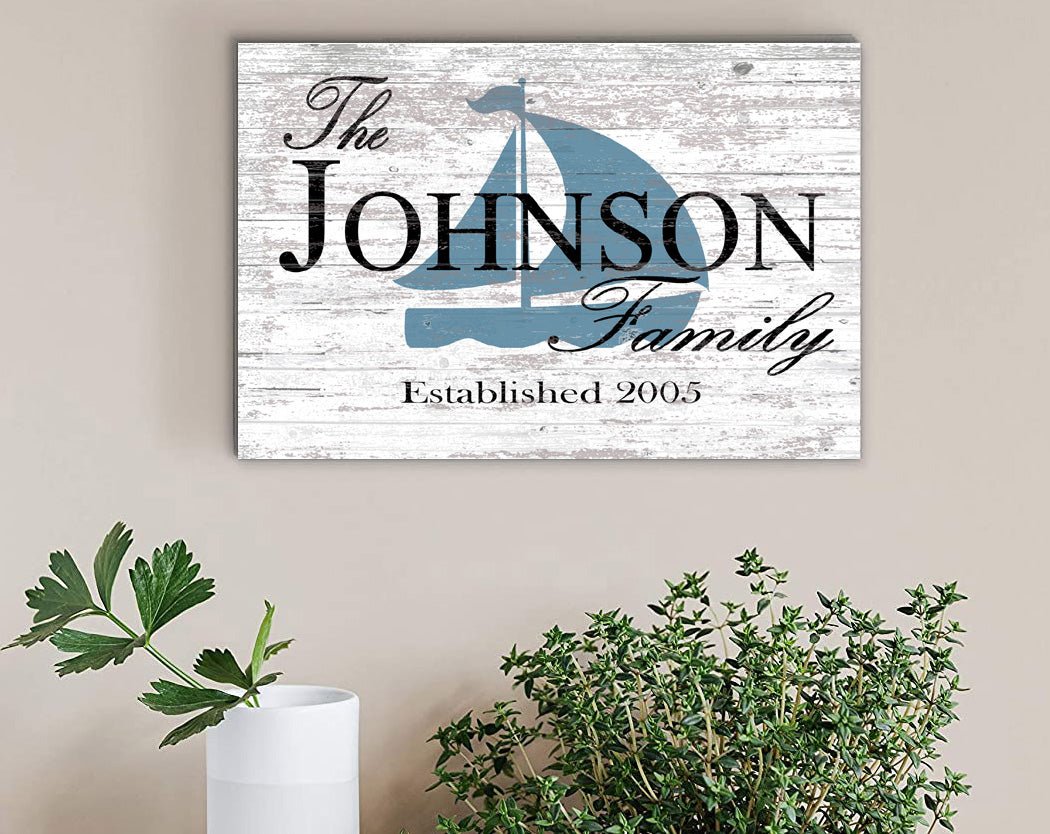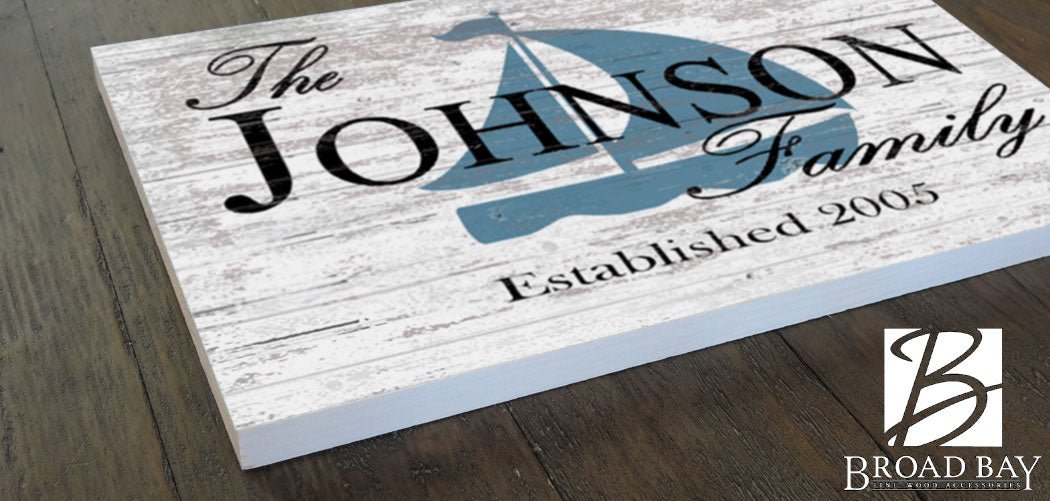 Capture the spirit of lake life or coastal living with this personalized nautical family sign. Featuring a soft blue sailboat graphic, your custom family name, and established year, this solid wood plaque adds a classic coastal feel to your boat house, lake cottage, or seaside retreat.
