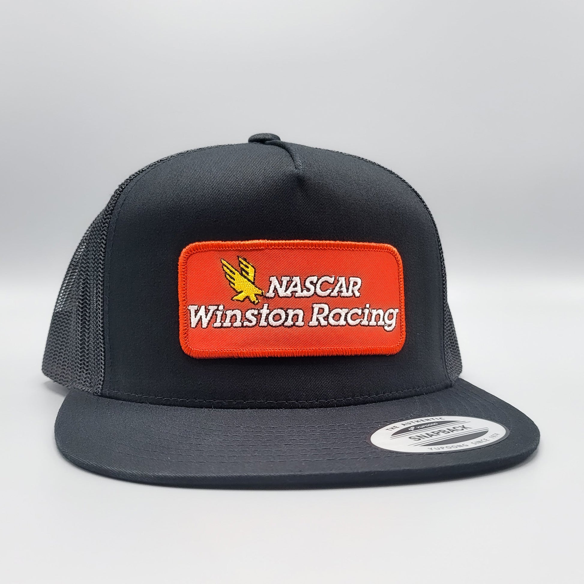 This listing is for a Nascar Winston Cup Series embroidered patch on one of our best selling (and best fitting) trucker hats -- a black Yupoong 6006 snapback classic trucker hat.