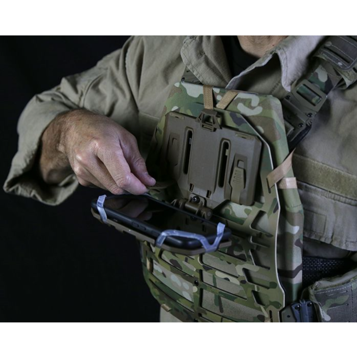 The Navboard® FlipLite™ is the natural evolution of S&S Precision’s original FlipLite™ offering enhanced durability and performance. Molded with impact modified Nylon, the NavBoard® FlipLIte™ is a case agnostic mobile device mounting platform enabling users to utilize their preferred case. The mobile device is secured to the device panel via silicone retention straps featuring internal ribbing to prevent the straps from peeling off the user's mobile device. An integrated friction hinge allows users to adjust tension to their preference, while the auto-stow bungee lock ensures the NavBoard® FlipLite™ is securely stowed when not in use. The NavBoard® FlipLite™ mounts to the 4 x 2 MOLLE/PALS field via two mounting straps, while the straps enable users to rapidly doff the platform when necessary.