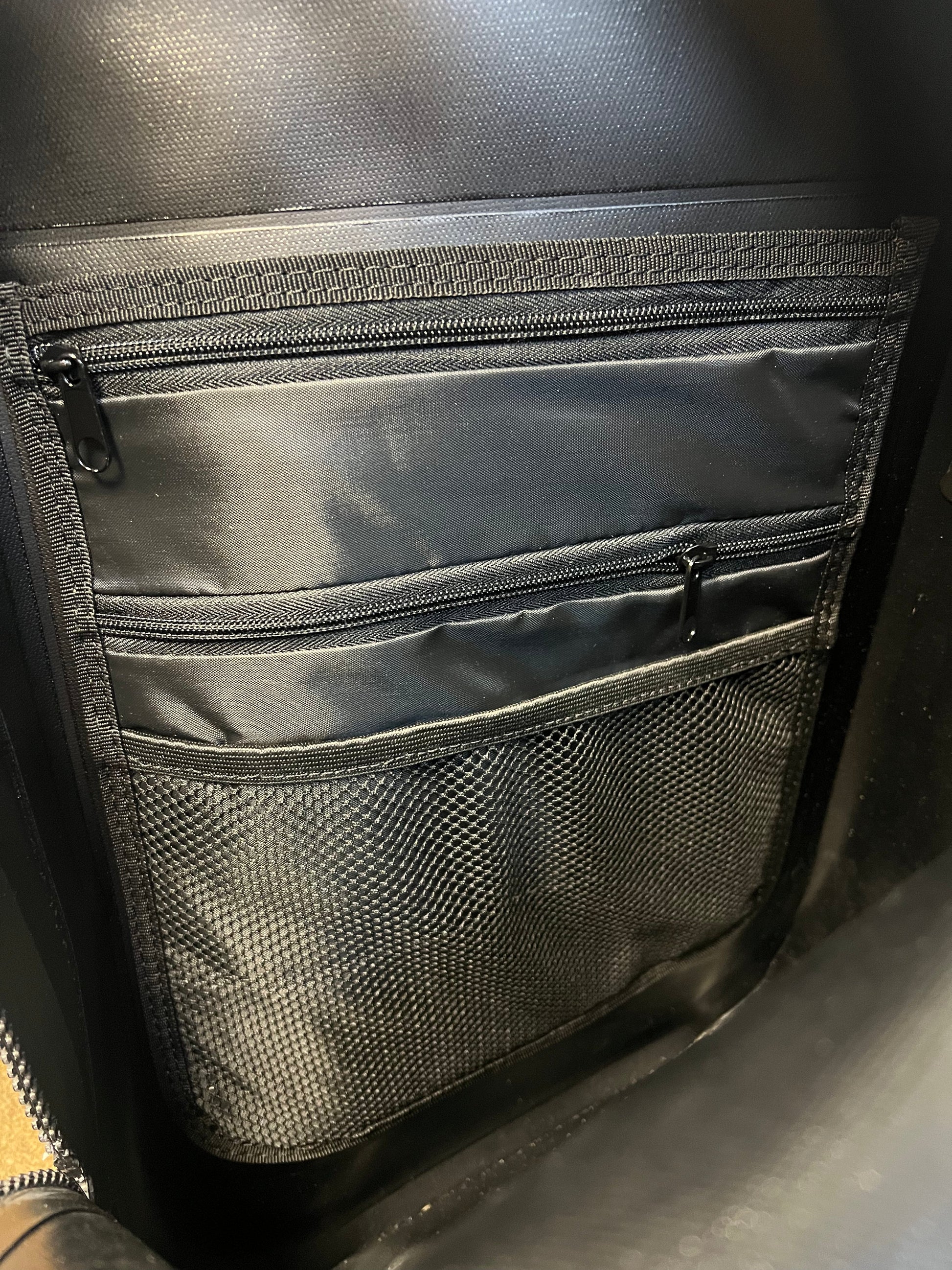 - Hydration bladder slot on bottom of bag with hose holder on strap