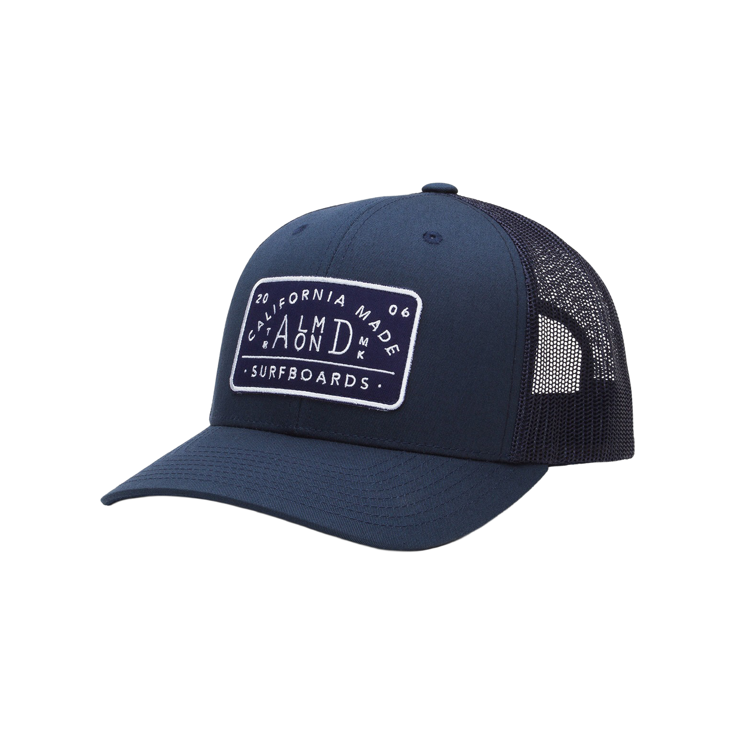Navy Blue Trucker Hat with Almond's "California Made Surfboards" woven patch. This hat fits a broad range of head sizes and shapes.