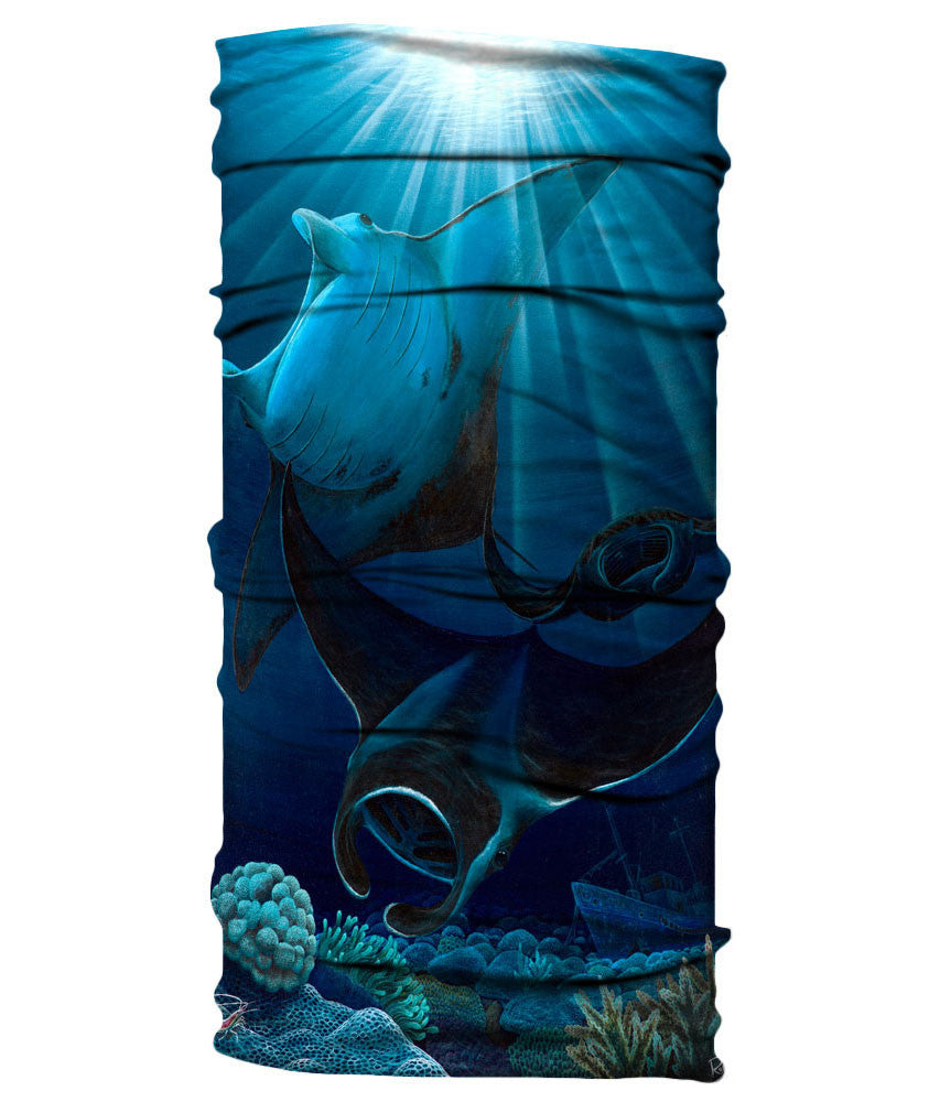 Three magestic manta rays dance below the wave with original art by Ryan Sobel on our exclusive neck gaiter. With a giant wingspan these creatures easily dwarf humans in comparison, but are gentle in nature. Our Solar Neck Gaiter is a multifunctional performance accessory that can be worn at least nine different ways. No matter if you call it a face shield, tubular bandana, buff, hoorag or gaiter, you'll find that our gaiters are superior to the other products on the market. Our solar gaiters are stylish and lightweight giving you protection from the sun without weighing you down. Our gaiters wick away moisture, dry quickly and help keep you cool and protected from harmful UV Rays.